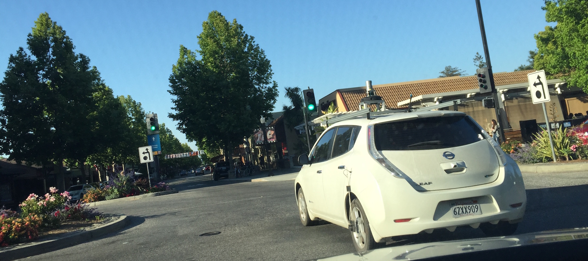 This Nissan Leaf with Lidar and circularly arranged camera system on the roof was spotted multiples times this week on Castro Street and the neighboring blocks in downtown Mountain View.