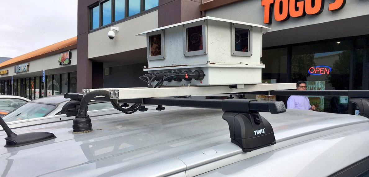 A Hyundai with a box with six cameras was spotted in the Bay Area by MacCallister Higgins, who works for autonomous driving startup Voyage. On the front seat was a monitor with cables attached.
