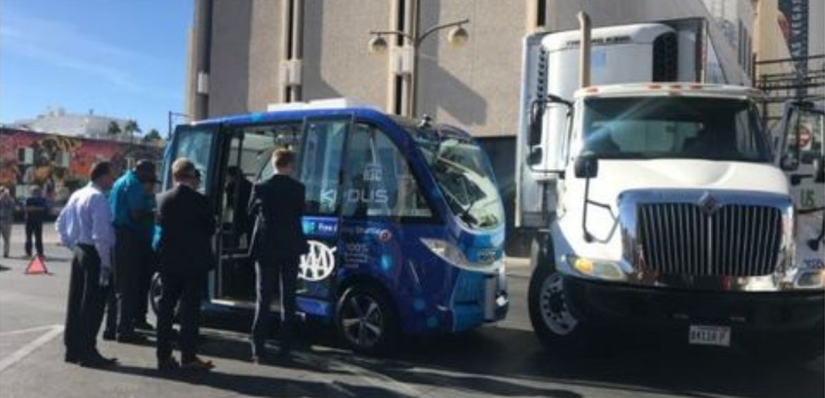 The test operation of a Keolis mini shuttle ended after only two hours in a crash, as reported by Las Vegas Now (Video inclusive). A semi truck missed the stopped mini bus while backing up and slightly touched it.