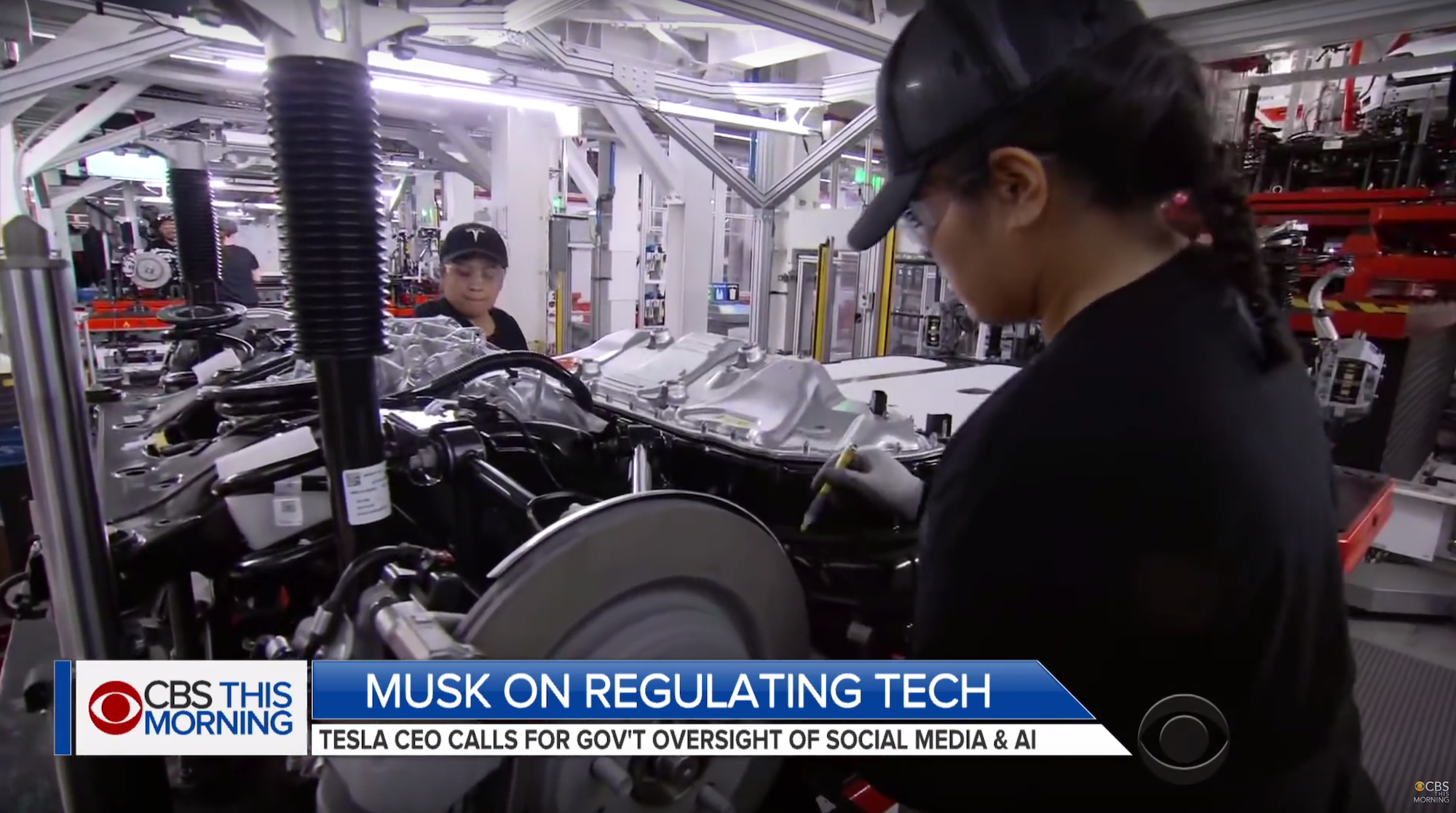 Elon Musk gave CBS This Morning a first tour through the production line of the Model 3 a the Tesla factory in Fremont. He walked with the show’s host Gayle King through the assembly hall and talks about the challenges in the production, but also his concern about AI and that it should be regulated.