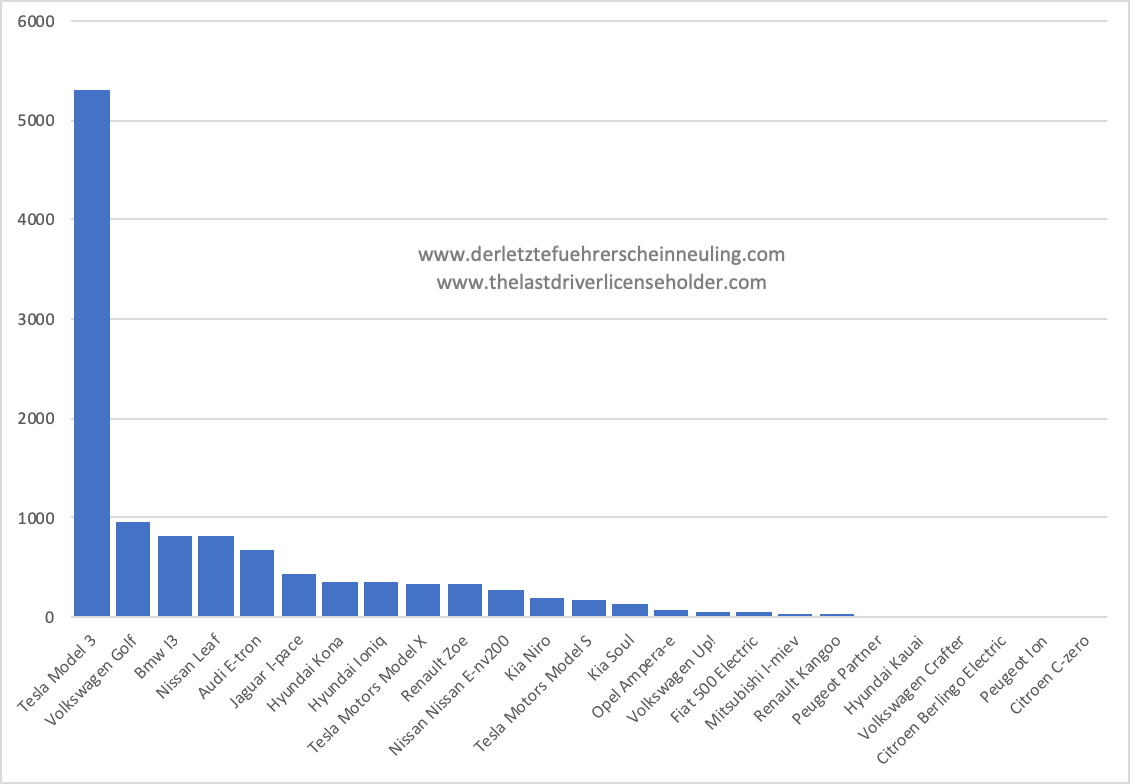 But in March the Model 3 set a strong claim of the top position. 5,302 Model 3 were registered in March 2019, which totals with the February numbers – where the delivery started in the second half – to 6,110 vehicles. The Model 3 found more buyers than the next 10 electric vehicles taken together. Of all electric vehicles sold in March, the Model 3 has a 46 percent share, doubling at the same time the electric vehicle registrations.