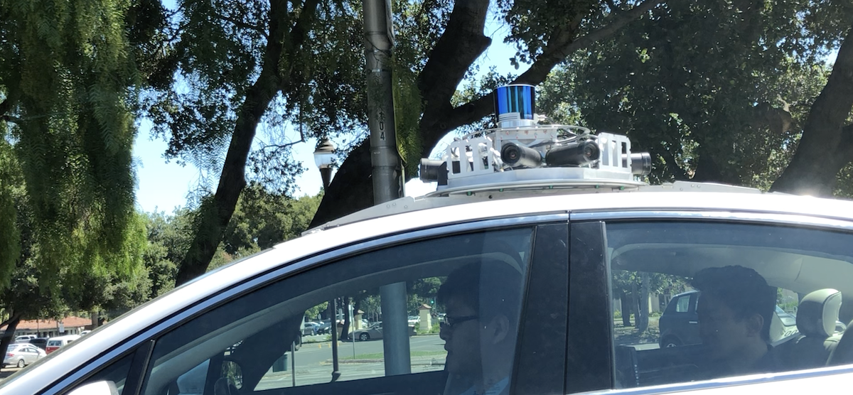 Here a closeup of the LiDAR and camera mounts on the roof of this Lyft autonomous car. This vehicle was spotted on El Camino Real in Palo Alto on Friday, June 7th, 2019.