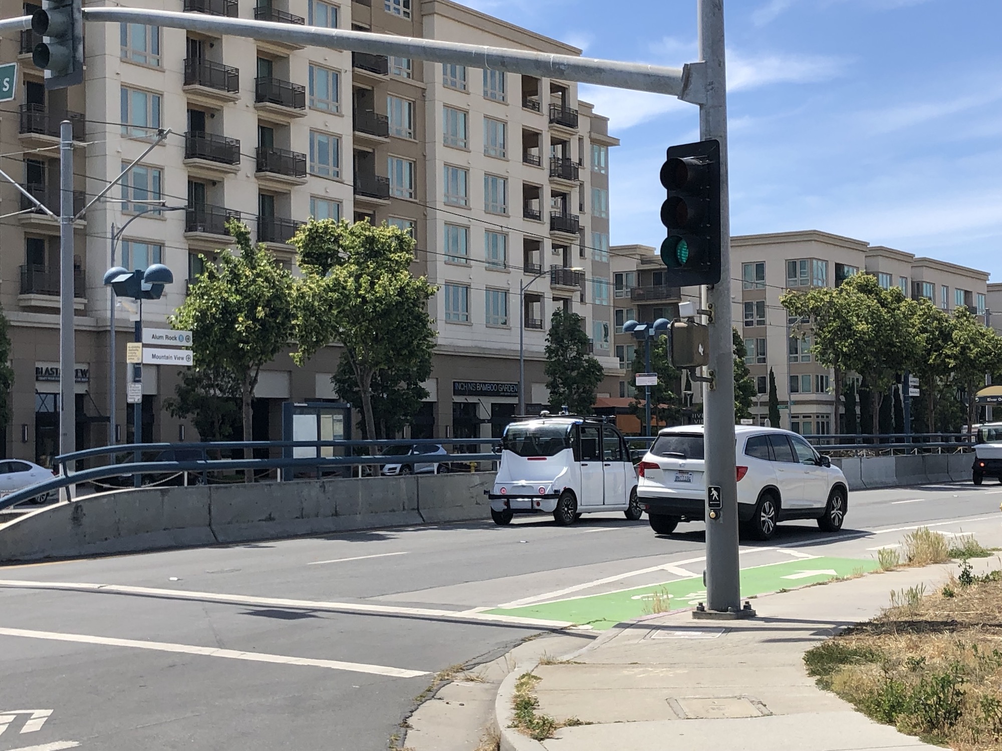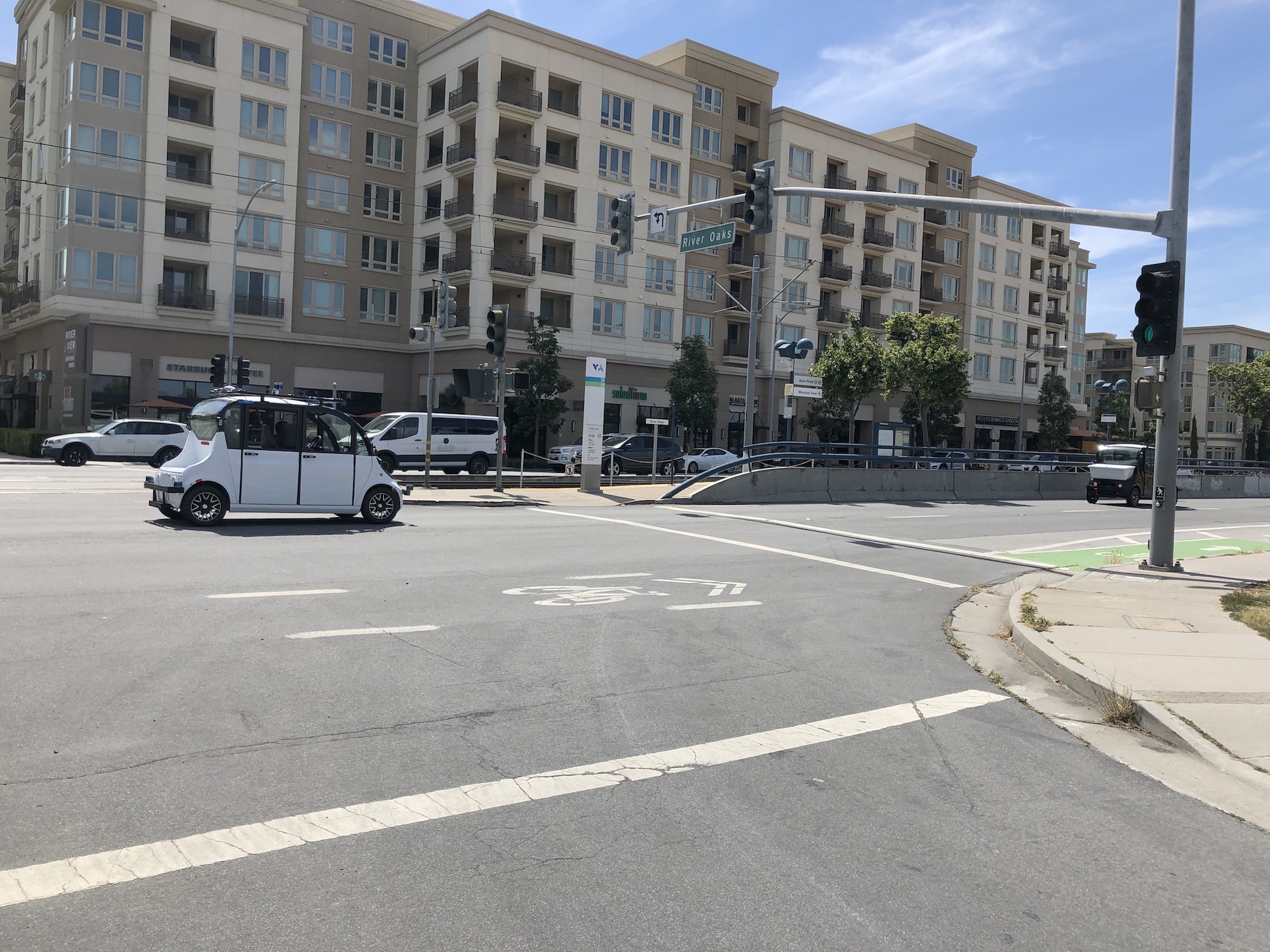 This unidentified golf cart with five LiDARs was spotted around 3:30pm on the intersection River Oaks Parkway and North 1st Street in San Jose. Leading this vehicle was another golf cart without sensors.