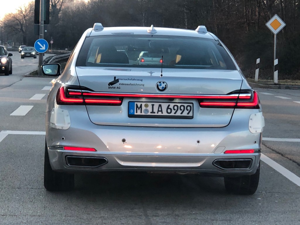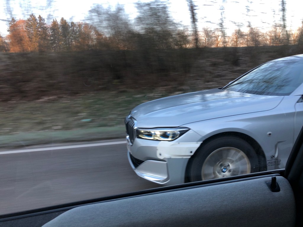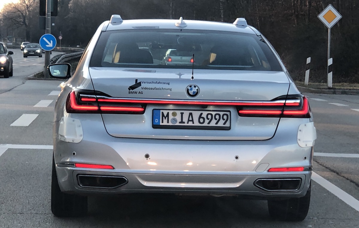 Our reader Dino Konrad has spotted another BMW test vehicle. He spotted this BMW 7 on April 1st, 2020 on the B11 between Wolfratshausen and Geretsried. As can be seen clearly, there are installations at the four corners of the vehicle, which are probably radar-equipped and the front ones seem to have cameras (the black holes). Also slightly above the front wheel there might be a camera, as well as in the middle of the rear window.