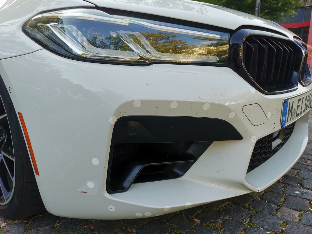This BMW vehicle was spotted in Obersendling in Munich by our reader Robert Brüggmann. There are no visible cameras or LiDARs on the vehicle itself. Note the many small white dots on the front and rear. What exactly is hidden behind them? Please give us some hints.