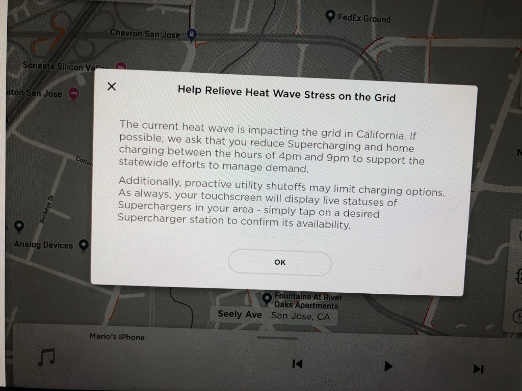 Yesterday, I got this message from Tesla on my Model 3 asking me to not charge between 4pm and 9pm, due to the current heat wave in California and the rolling blackouts.