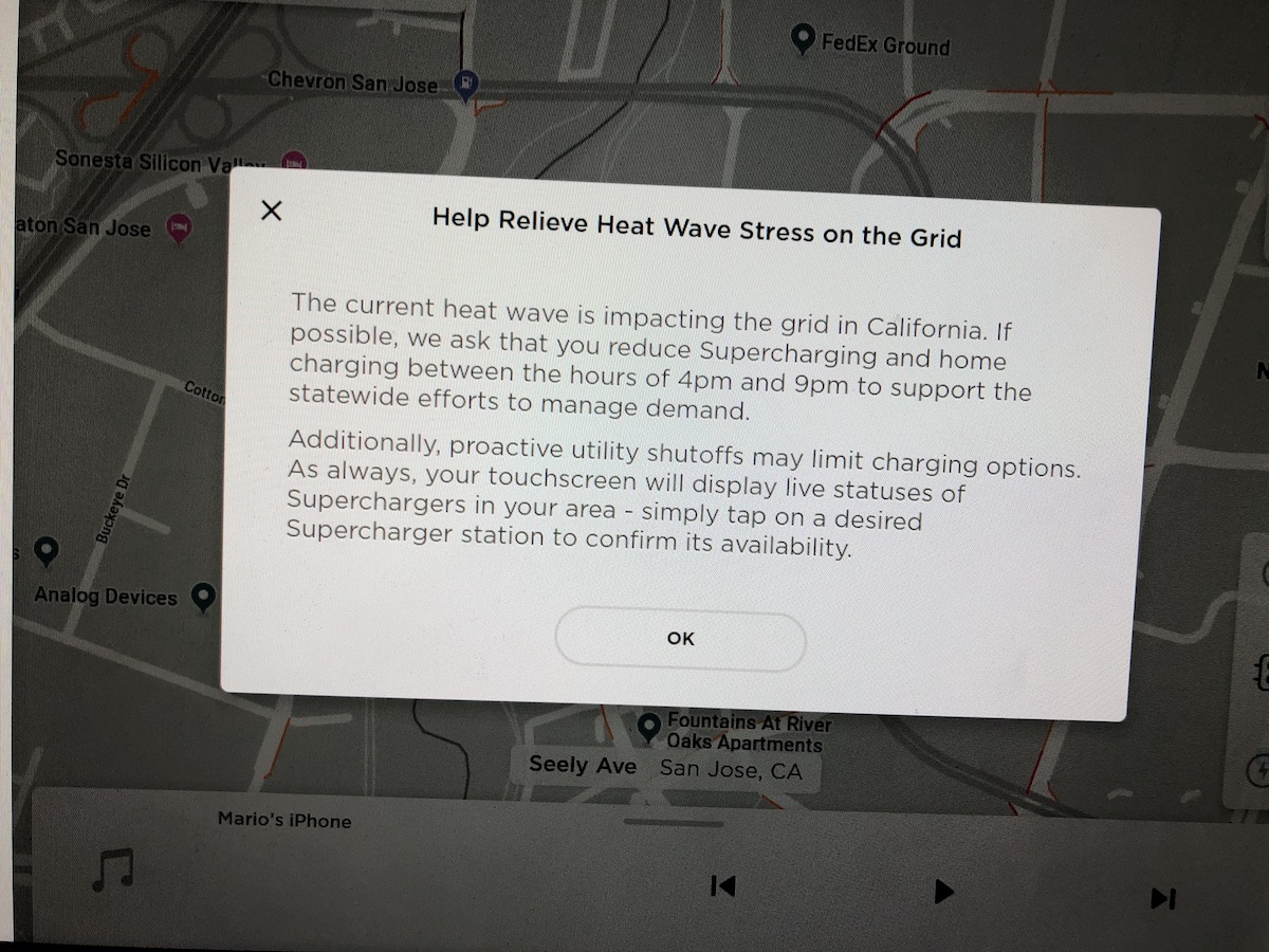 Yesterday, I got this message from Tesla on my Model 3 asking me to not charge between 4pm and 9pm, due to the current heat wave in California and the rolling blackouts.
