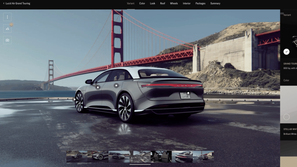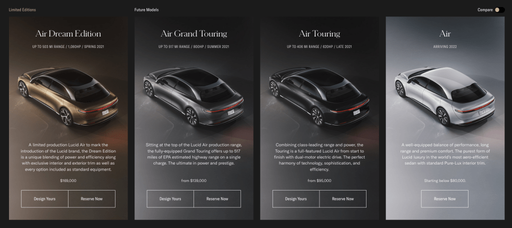 The first available vehicle will be the limited version of the Lucid Air Dream, prices at for 169,000 US dollars. This will be followed in 2022 by the Lucid Air Grand Touring, which will be available from 95,000 US dollars. Orders can be placed on the website, which is now unlocked and took suggestions from video games. Customers can take the online configuration of the vehicle to Lucid Studios and then experience it virtually. The first Lucid Studio is scheduled to open outside the Newark headquarters in Beverly Hills.
