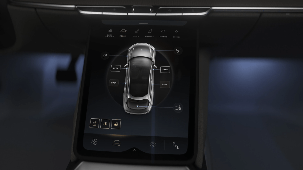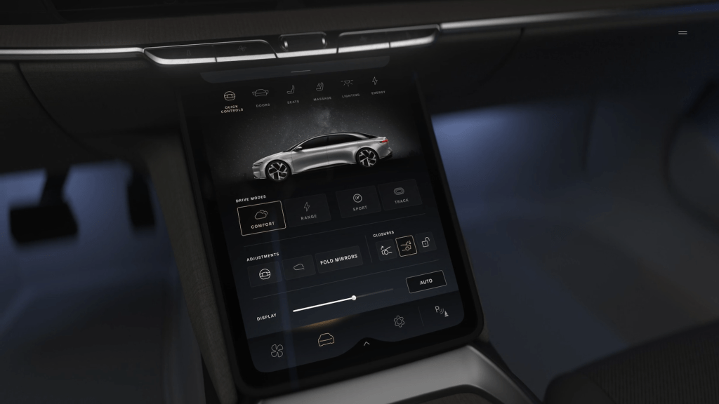 The vehicle is operated via a 5K floating display and a central console, which also hides storage space. Inductive chargers for smartphones are integrated in the center console, and 28 speakers with 800 watts of power provide the appropriate hi-fi sound inside the car. It can also be opened and monitored using a smartphone app.