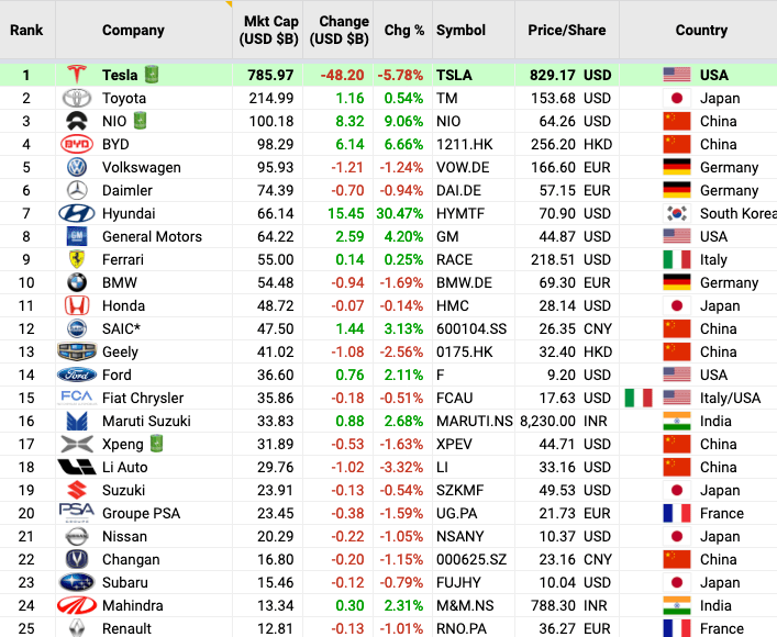 The world is changing, and how much can be seen in the stock market valuations of automotive companies. Today, two Chinese electric car manufacturers, NIO and BYD, overtook Volkswagen in market capitalization. At just under $100 billion, NIO is closely followed by BYD at $98 billion now ahead of Volkswagen at $95 billion valuation. Also note that there is only one German company left among the Top 5 and that 7 of the 25 most valuable manufacturers are now Chinese companies.