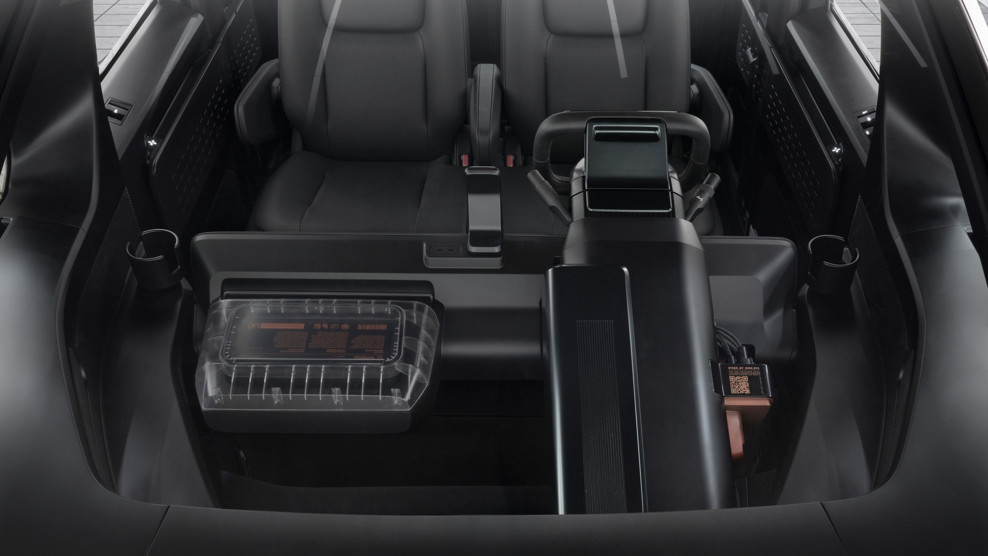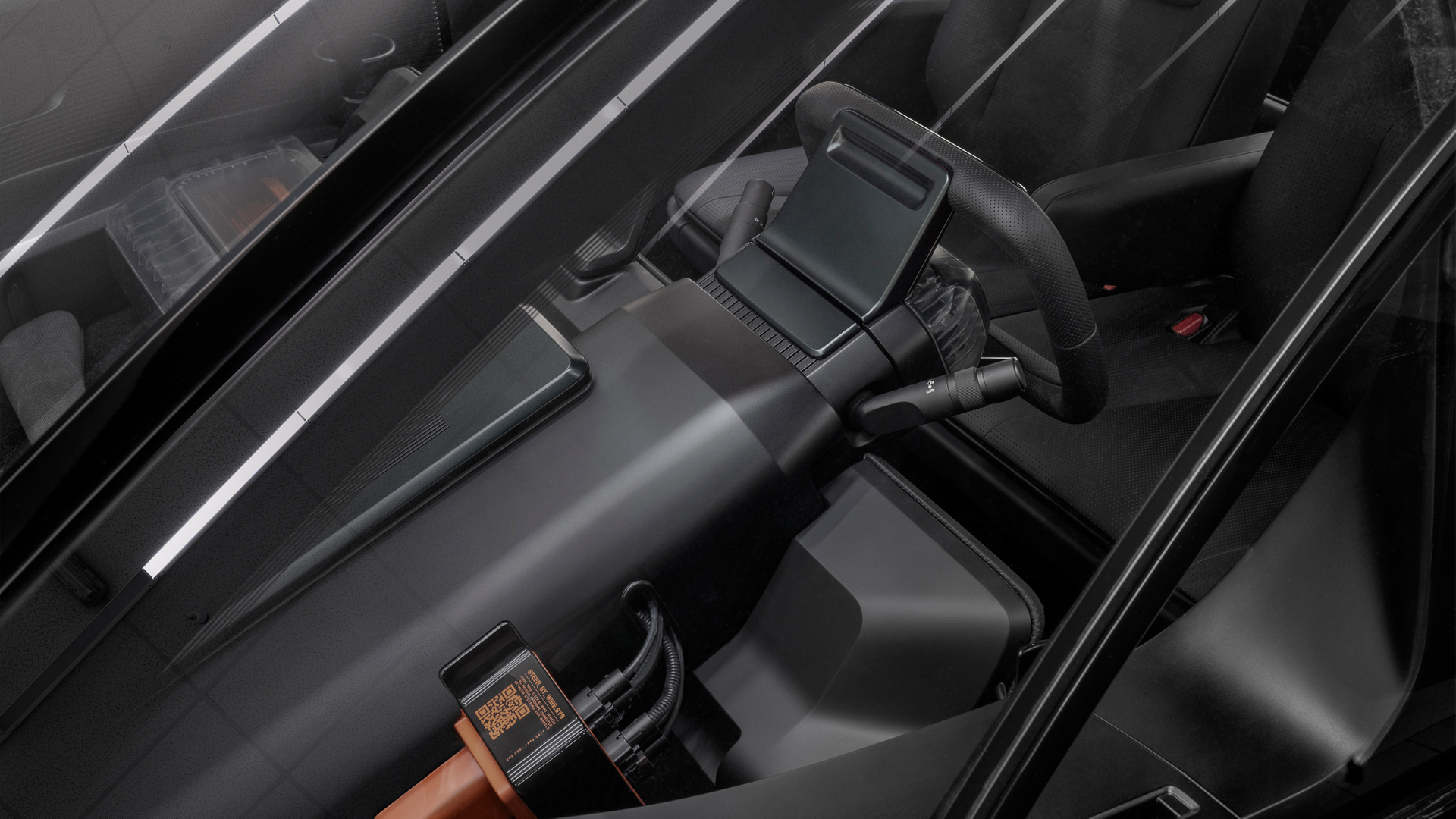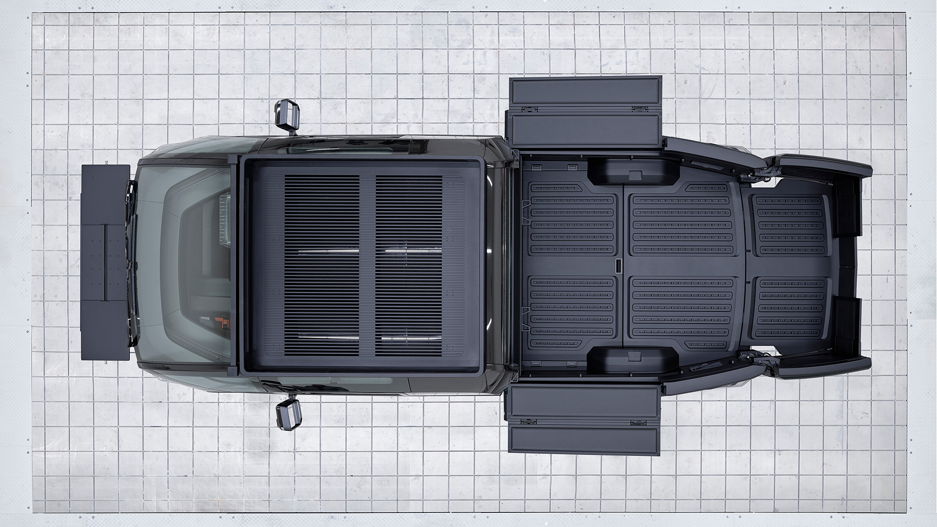 The pickup comes with some small but nice details, like a pull-out cargo bed, fold-down side panels, power outlets and also a rectangular steering wheel (a.k.a. yoke steering control), like the new Tesla Model S already.