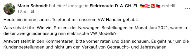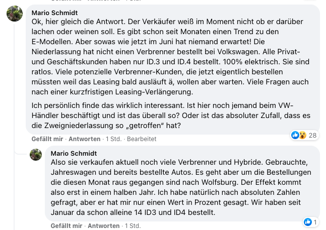 Ok, here is the answer right away. The sales rep doesn’t know whether to laugh or cry about it at the moment. There has been a trend towards the electric models for months. But nobody expected something like now in June! The dealership hasn’t ordered a single combustion engine vehicle from Volkswagen. All private and business customers have ordered only ID.3 and ID.4. 100% electric. They are at a loss. Many potential internal combustion customers, who would actually have to order now because the lease is about to expire, are waiting. Many also ask for a short-term lease extension.