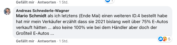 when I ordered another ID.4 the other day (end of May) my sales rep told me that they had sold well over 75% e-cars so far in 2021 … so not 100% as with the dealer but still the majority electric cars …