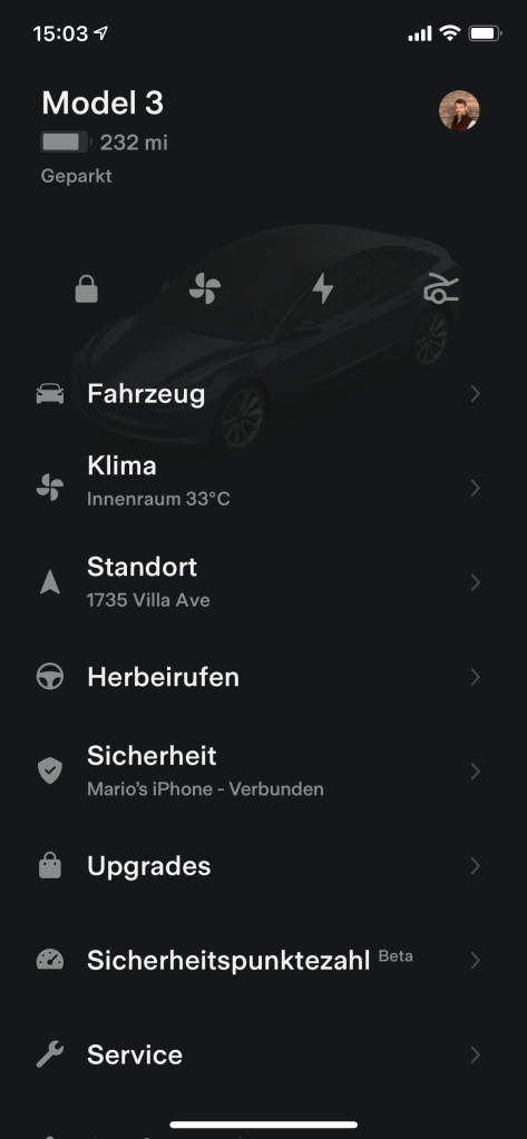 After the request in my Model 3 to participate in the FSD Beta program, I first had to download the updated version of the Tesla App. There, between the menu items Upgrades and Service (and yes, although I live in the US, I use the German language setting both in the app and in the car), the new entry Safety Score Beta appeared.