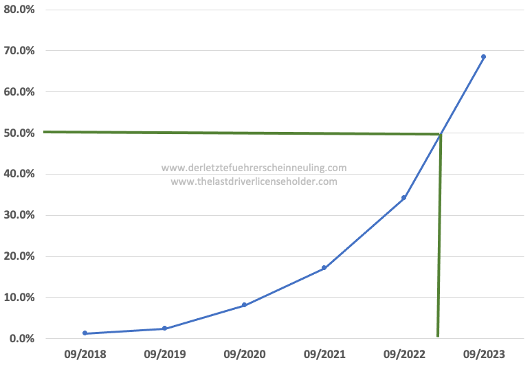 This September showed that electric cars have finally arrived in Germany. With a 17.1% share of new registrations, one sixth of all newly registered cars are electric. And the growth rates are phenomenal. We are currently seeing a doubling of the share in less than a year. While in September three years ago, just 1.18% of all new registrations were pure battery electric vehicles, one year later the figure was already 2.4%. In September 2020, the figure exploded to an 8% share.