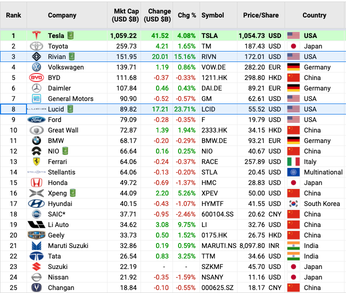 Among the ten most valuable car companies, Tesla, Rivian and Lucid are three pure electric car manufacturers, while two others, Nio and Xpeng, rank 12th and 16th. only