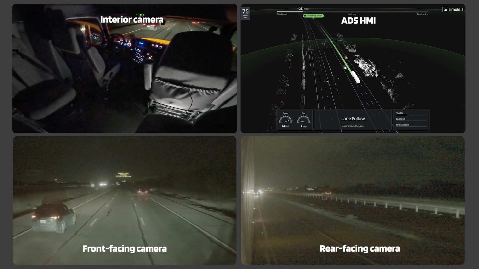 TuSimple has released an uncut video of the entire night drive, which lasted just under 80 minutes, with camera angles to the front and rear, as well as directly from the driver’s cabin. A look at the software screen can also be seen, showing what the vehicle’s sensors see.