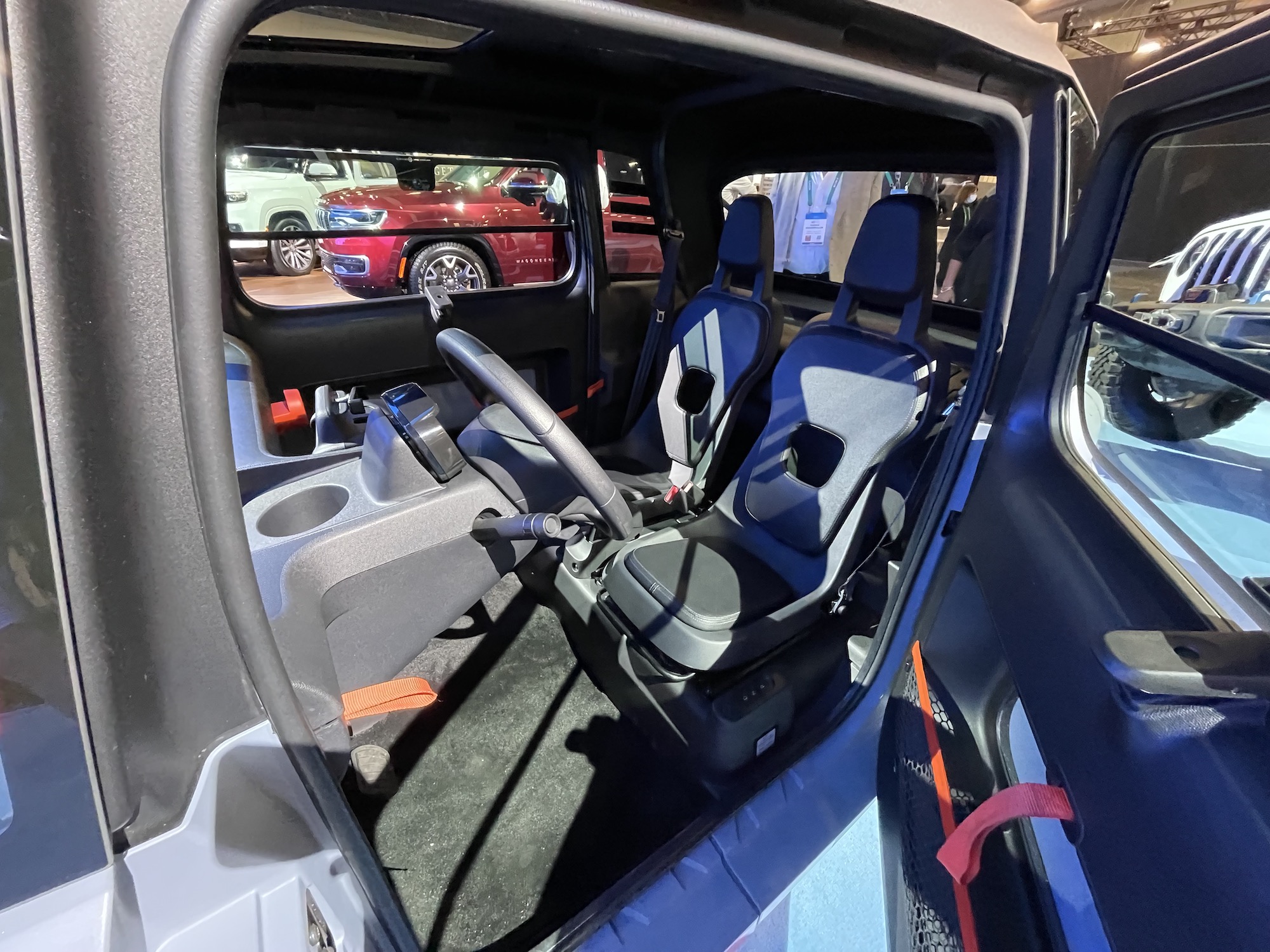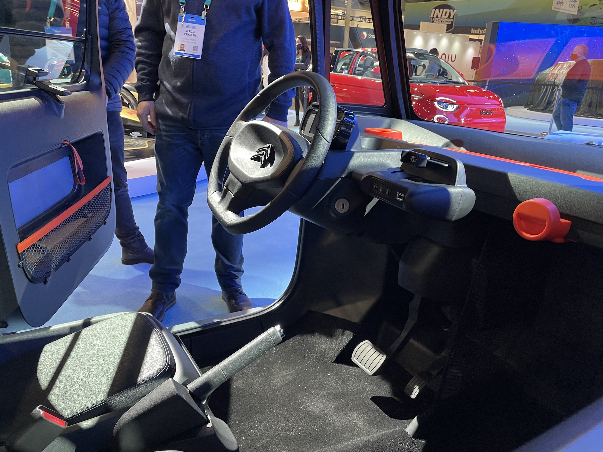 First of all, the vehicle is really very small, just two people fit in and suitcases? Forget it! All the material is plastic. The doors, the exterior parts, the interior parts. The only thing that doesn’t seem to be plastic is a leather loop that you use to pull the door closed, more like slam it shut. And even that is probably made of imitation leather. Otherwise, no frills, just functional, a car that you can only drive in winter in a thick coat.