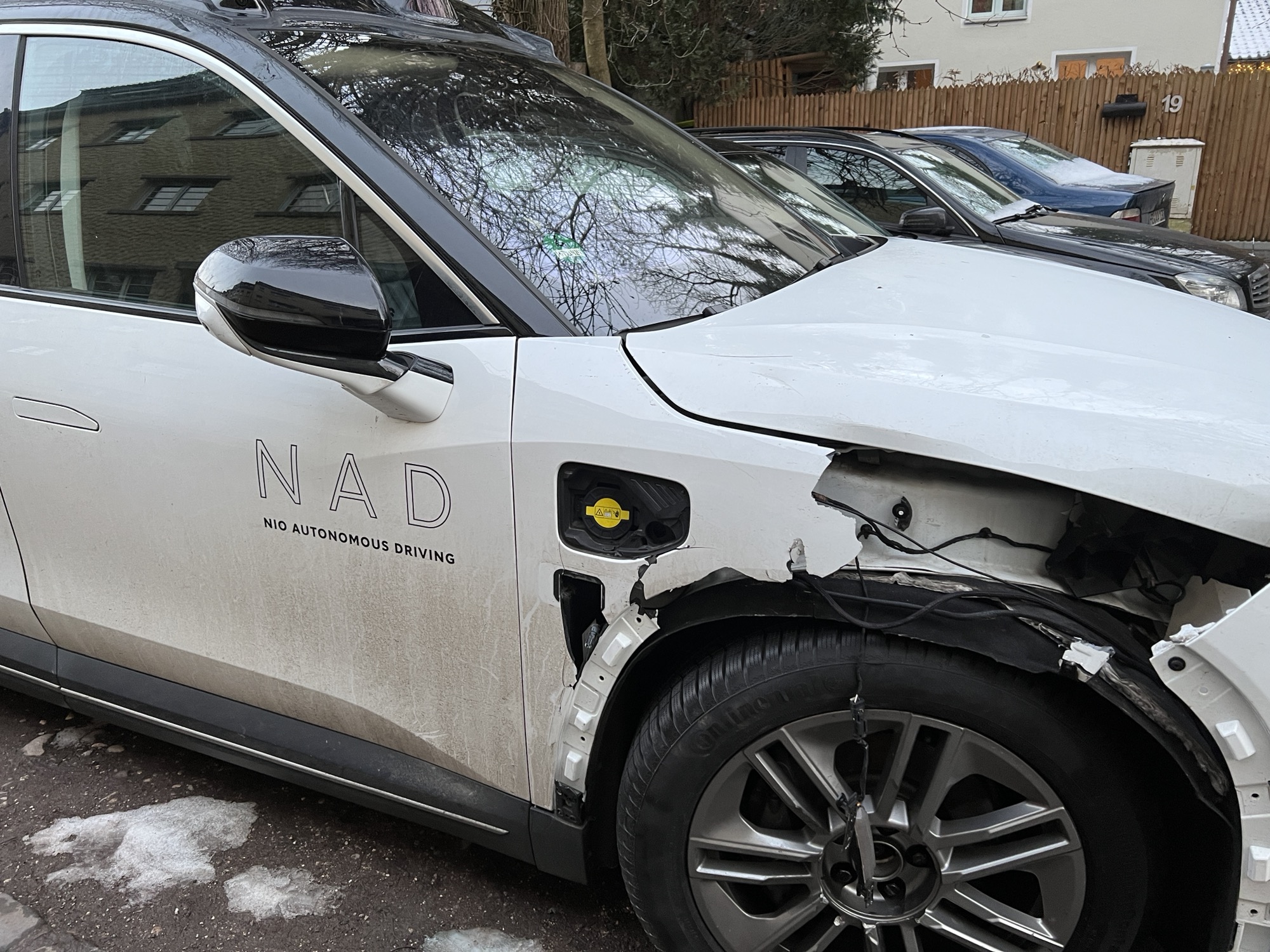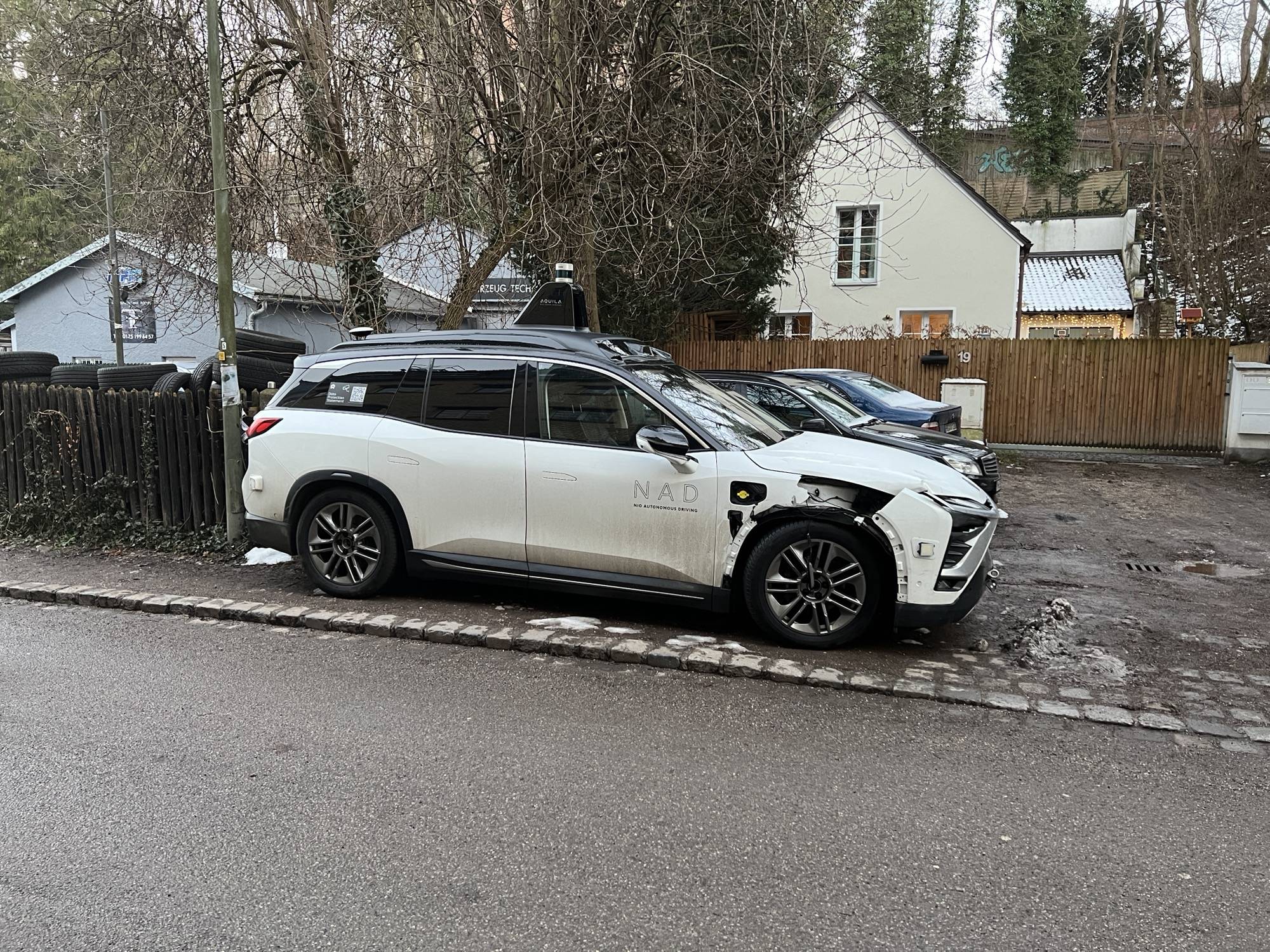 A vehicle from the autonomous technology development (NAD) division of Chinese electric car manufacturer NIO, in partnership with Mobileye NIO-Moovit, was apparently involved in a collision in Munich, Germany. This pictured vehicle was spotted in a garage parking lot and posted by reddit user D-Fence.