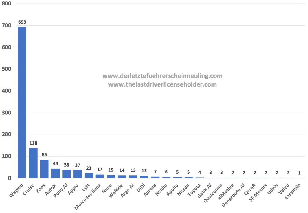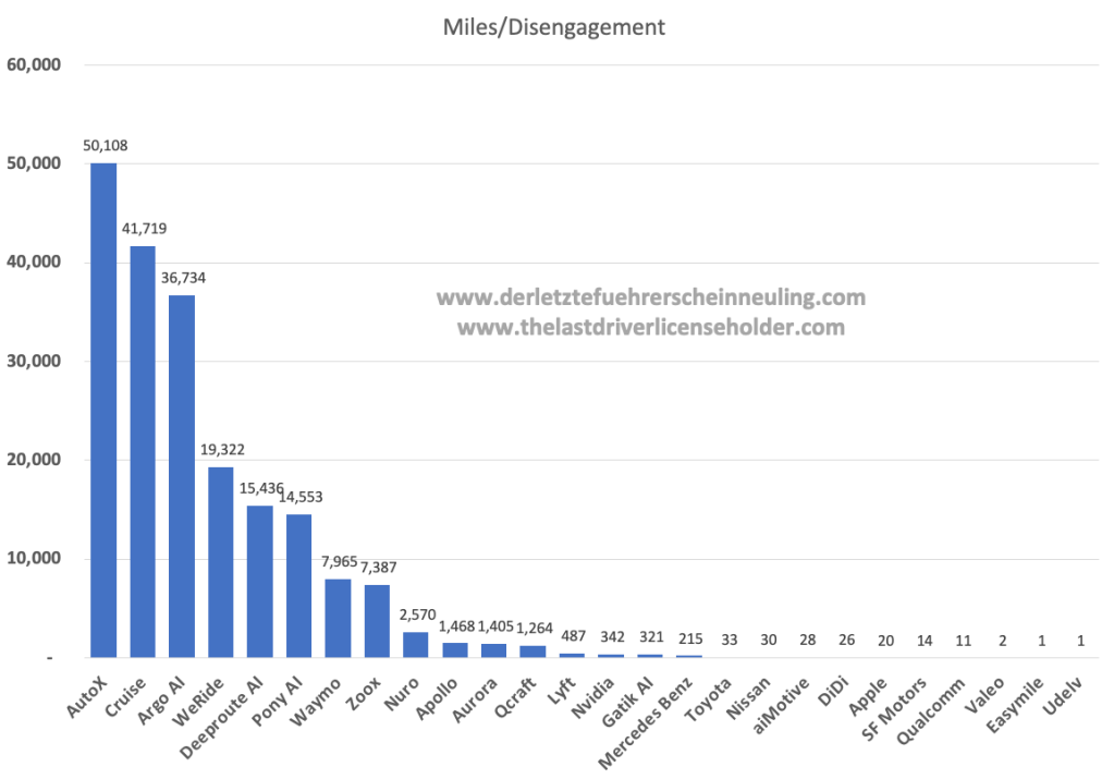 Apple, on the other hand, does not seem to be a competitor to be reckoned with in the near future with the current state of development; the numbers are too far away from the top companies. It is interesting to see that many Chinese companies are in the forefront and are putting significant effort into it. AutoX, for example, now has 1,000 vehicles in operation in China.