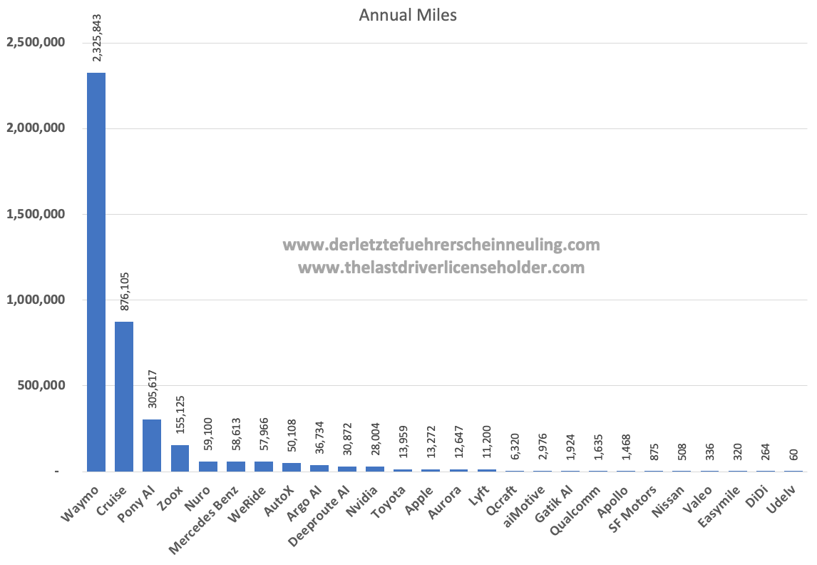 We see a densification of the field, increasing mileage per disengagement, but also challenges that rides in new cities and regions and with new vehicles offer to companies. We are particularly pleased to see driverless rides included for the first time. Even though it was “only” 40,000 miles this time, a big jump is expected with next year, as Waymo is about to launch its driverless robotaxi operation in San Francisco, and Cruise will presumably be able to expand driverless operations, previously limited to between 11 p.m. and 5 a.m.