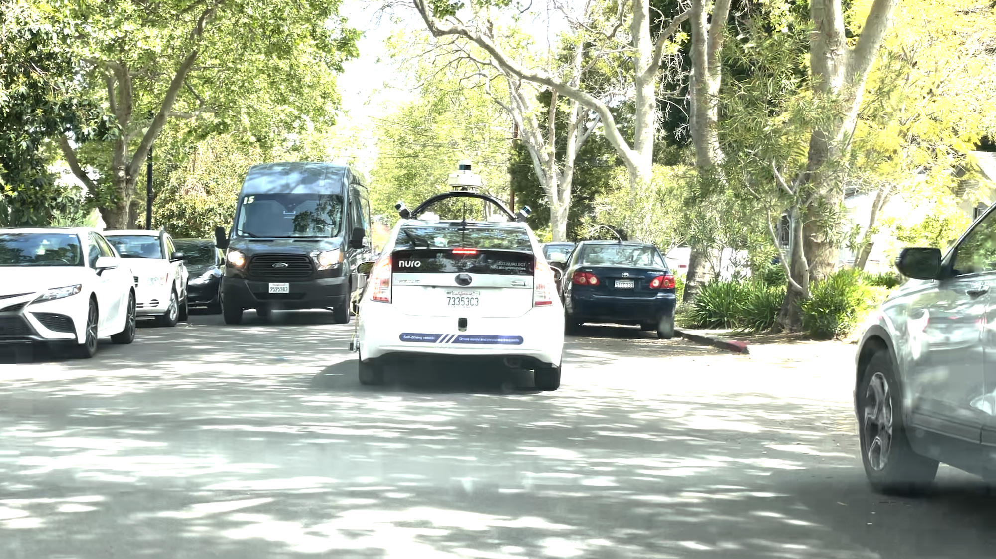 Delivery robot maker Nuro’s extensive fleet is busy testing. I was able to watch one vehicle navigate narrow streets in Mountain View, where double-parked cars and other challenges awaited. The vehicle can be seen carefully moving through several narrow sections.
