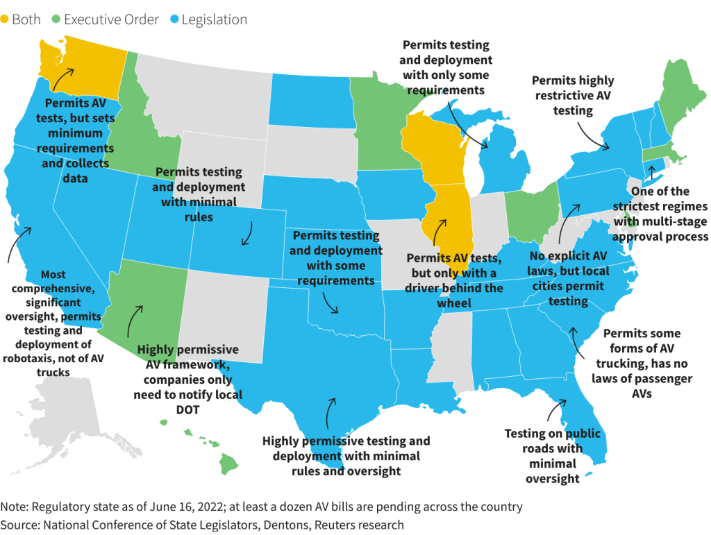 Reuters published an overview of the status of regulations in the US states. Unsurprisingly, California leads the way with the most extensive regulations, due to the high concentration of companies involved in this technology development in California. But other states are also very advanced with related regulations. Some states have no specific regulations at all, and therefore tests with autonomous vehicles are automatically allowed there.