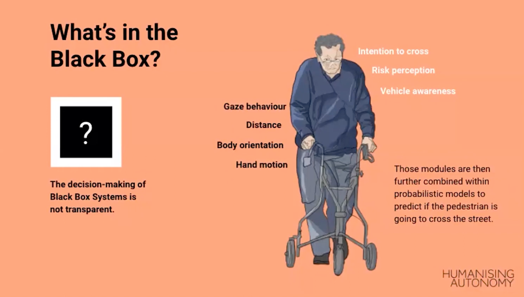 We had already presented examples of this here, such as the duck that was chased and scared away by a woman in an electric wheelchair. Or the two women at the side of the road, where the car has to understand whether they want to cross the road or not.