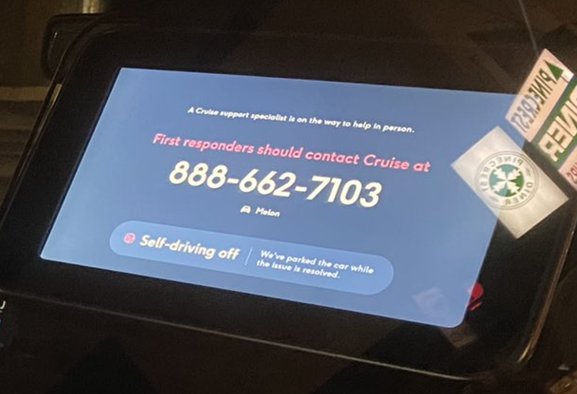 A telephone number is also displayed for emergency responders to call to rectify the situation. The number then also states that the self-driving mode has been switched off.
