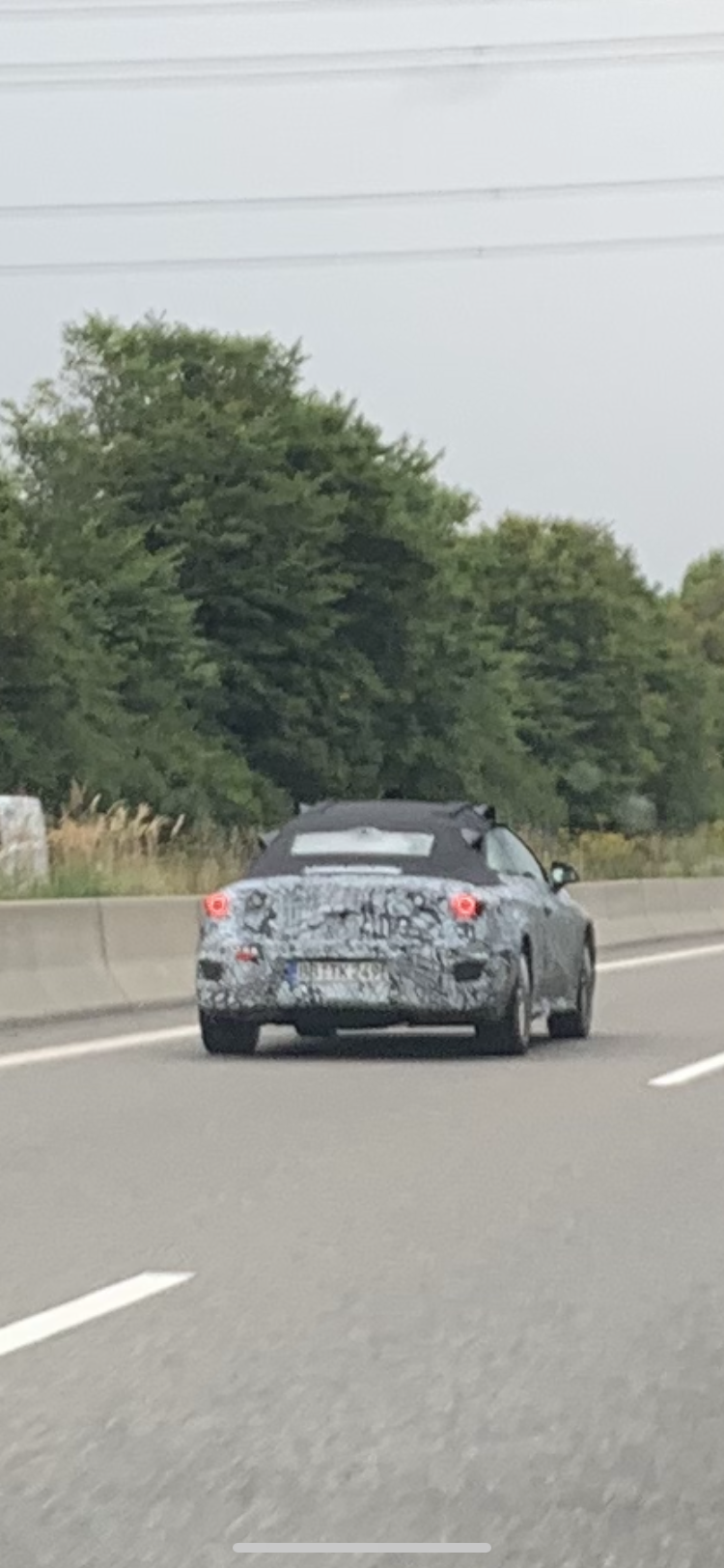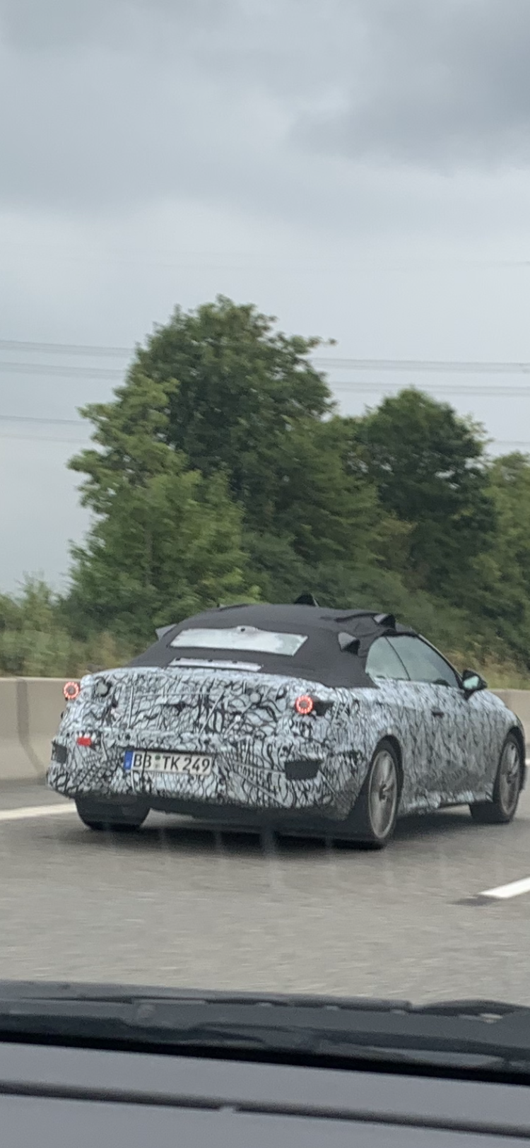 A Mercedes convertible with camouflage foiling was spotted today by our reader Gerd Moll on the highway A 81 in the direction of Singen near Rottweil in Germany. Note the protrusions on the roof of the convertible for the sensors installed there (cameras, lidars?), as well as the camera at the rear window and the radars/lidars(?) at the bumpers.