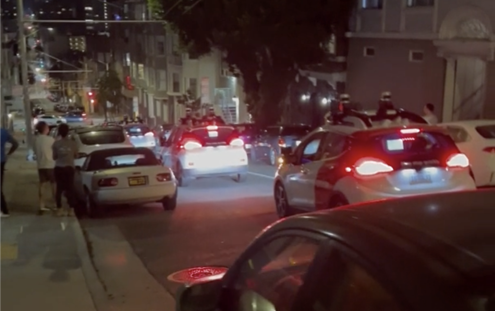 Another incident of Cruise Robotaxis failing to provide service. These three Cruise vehicles blocked traffic at the intersection of Sacramento Street and Leavenworth Street in San Francisco during the night on September 23, 2022.