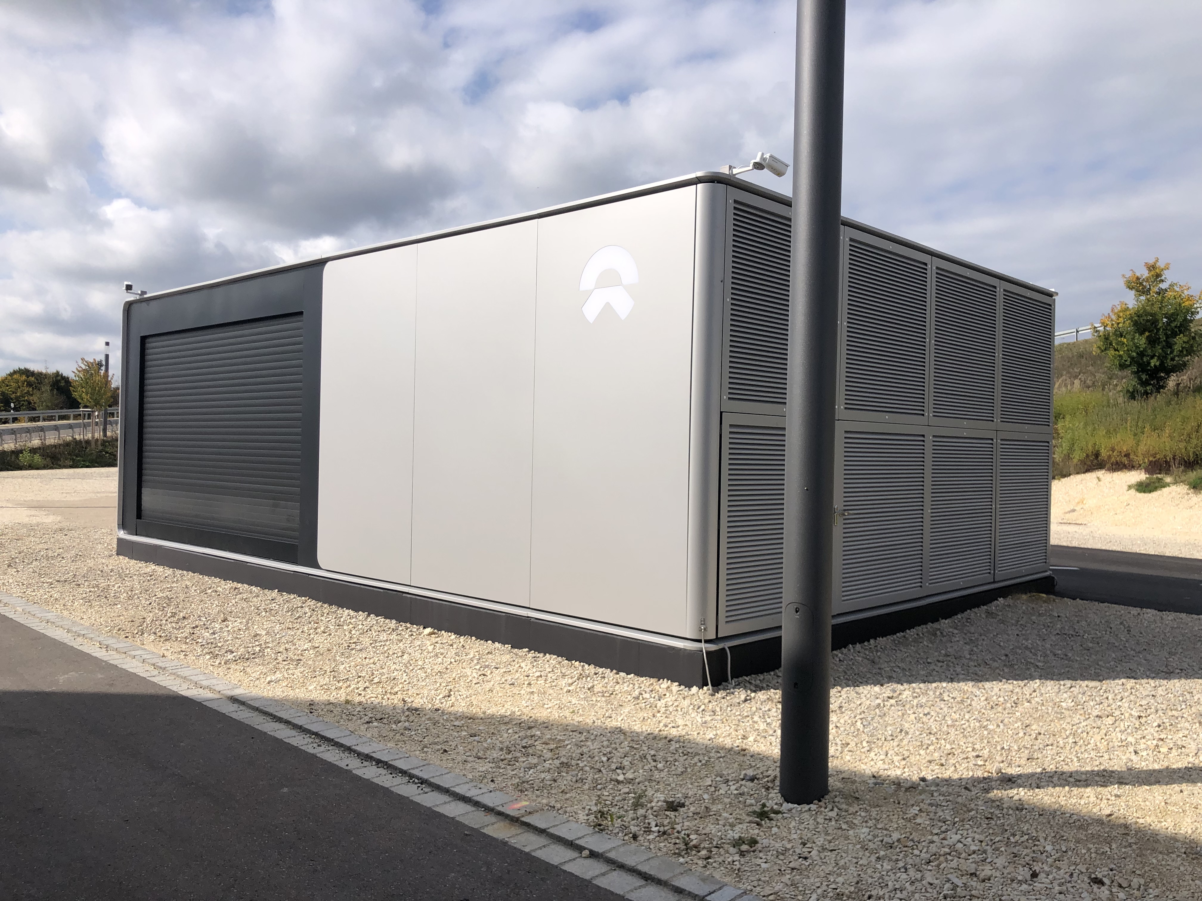 Our reader Dino Konrad sent us these pictures of the NIO battery exchange station on the A8 freeway near the Dasing exit in the direction of Munich. The technician present spoke of 12 battery packs that would be ready at the station.