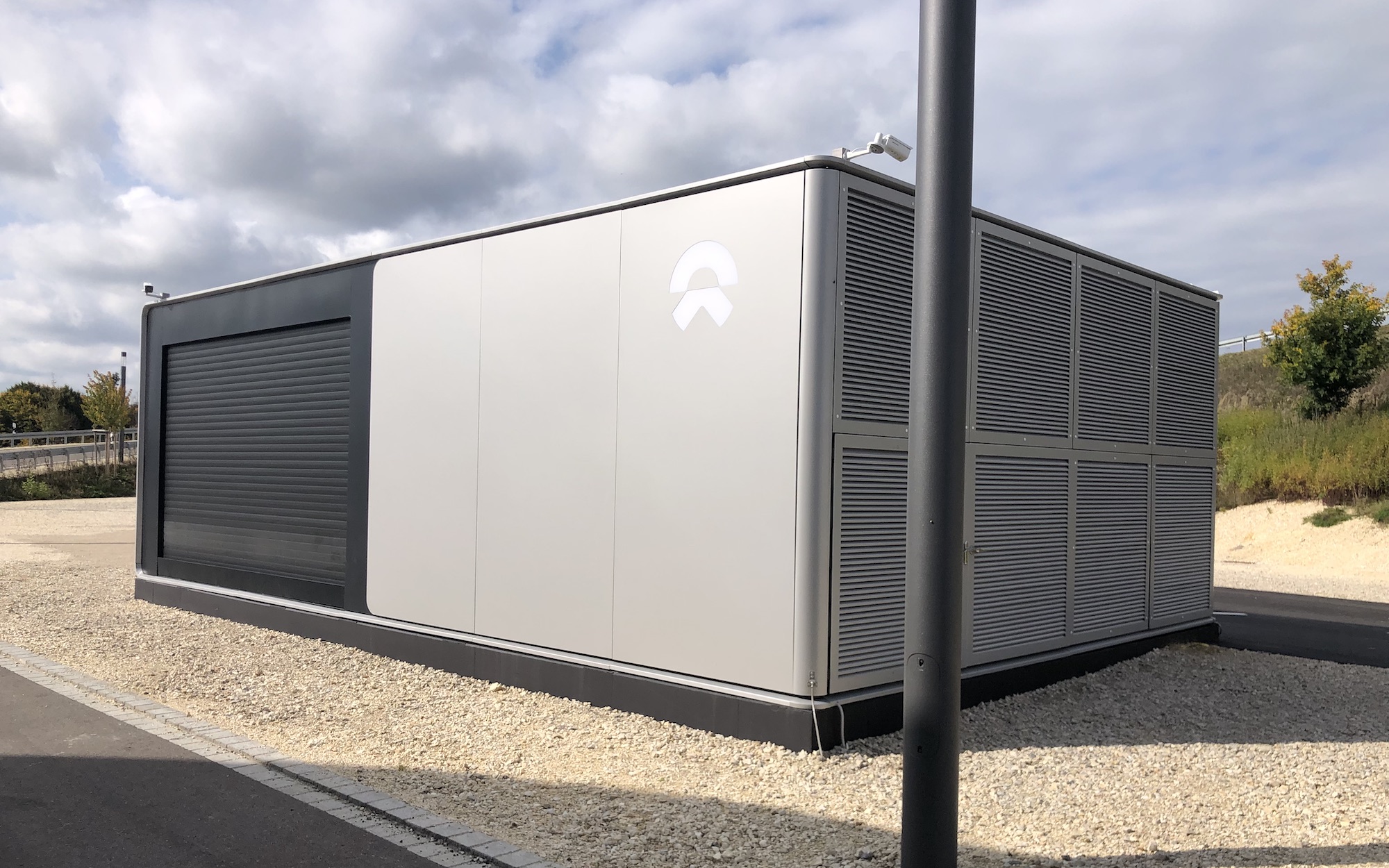 Our reader Dino Konrad sent us these pictures of the NIO battery exchange station on the A8 freeway near the Dasing exit in the direction of Munich. The technician present spoke of 12 battery packs that would be ready at the station.