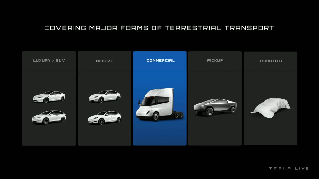 In the presentation, Musk also talked about Tesla’s corporate mission, which along sedans, SUVs, pickups and now the Tesla semi-truck also hinted at a robotaxi. However, this was still shrouded on the slide.