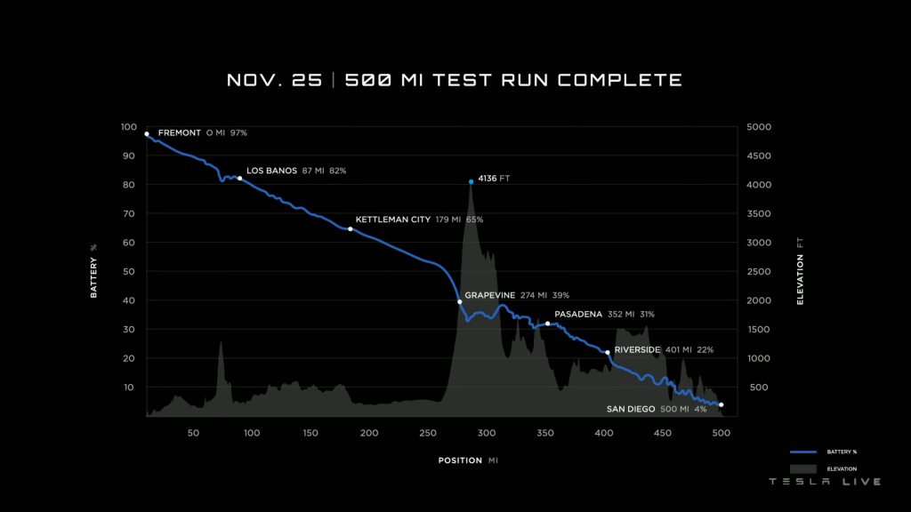 Also shown was the 800-kilometer (500-mile), approximately eight-hour drive from Fremont to San Diego on Nov. 25, 2022, completed without a hitch and with a full load, which should eliminate any concerns about range. This also involved overcoming several mountain passes and inclines.