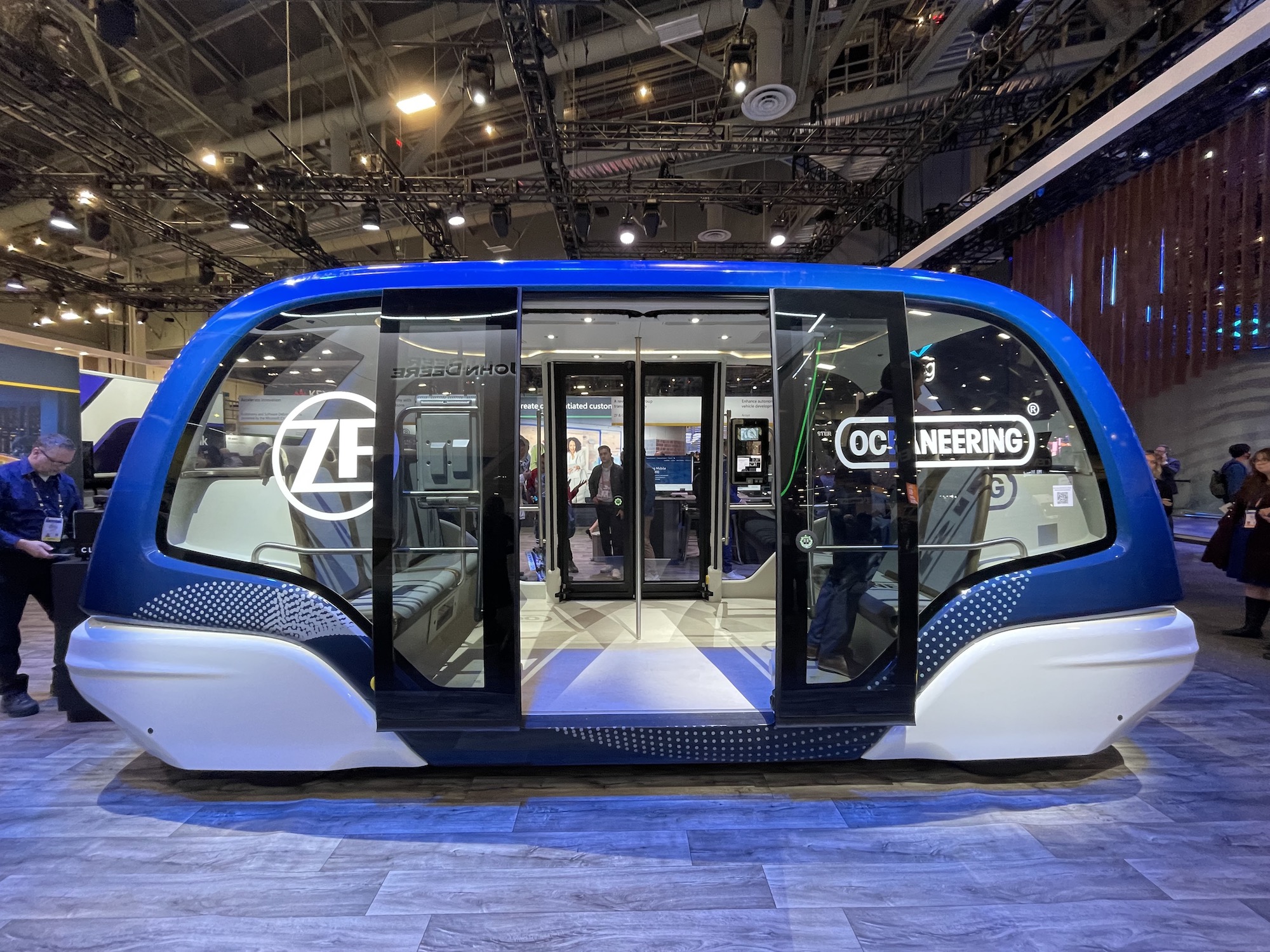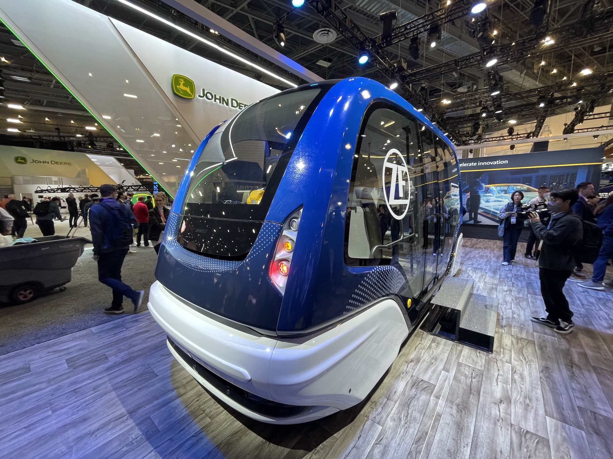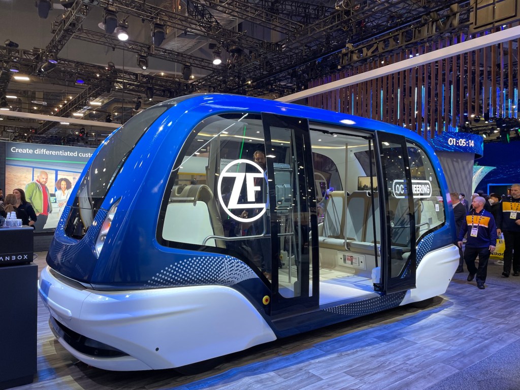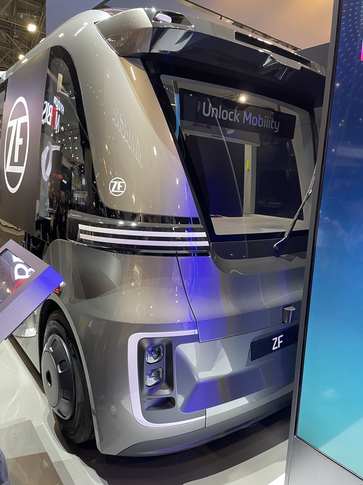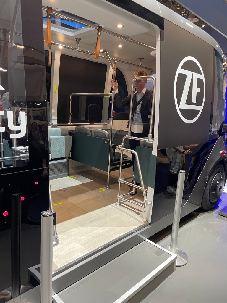 In addition to a number of robot cabs without steering wheels from companies such as Waymo or Zoox, a number of so-called people movers were also on display. ZF from Friedrichshafen presented two of them. Here are some impressions of the two vehicles, which differ in size. The first vehicle still looks like a concept, while the second newly presented one already looks like a practical version…
