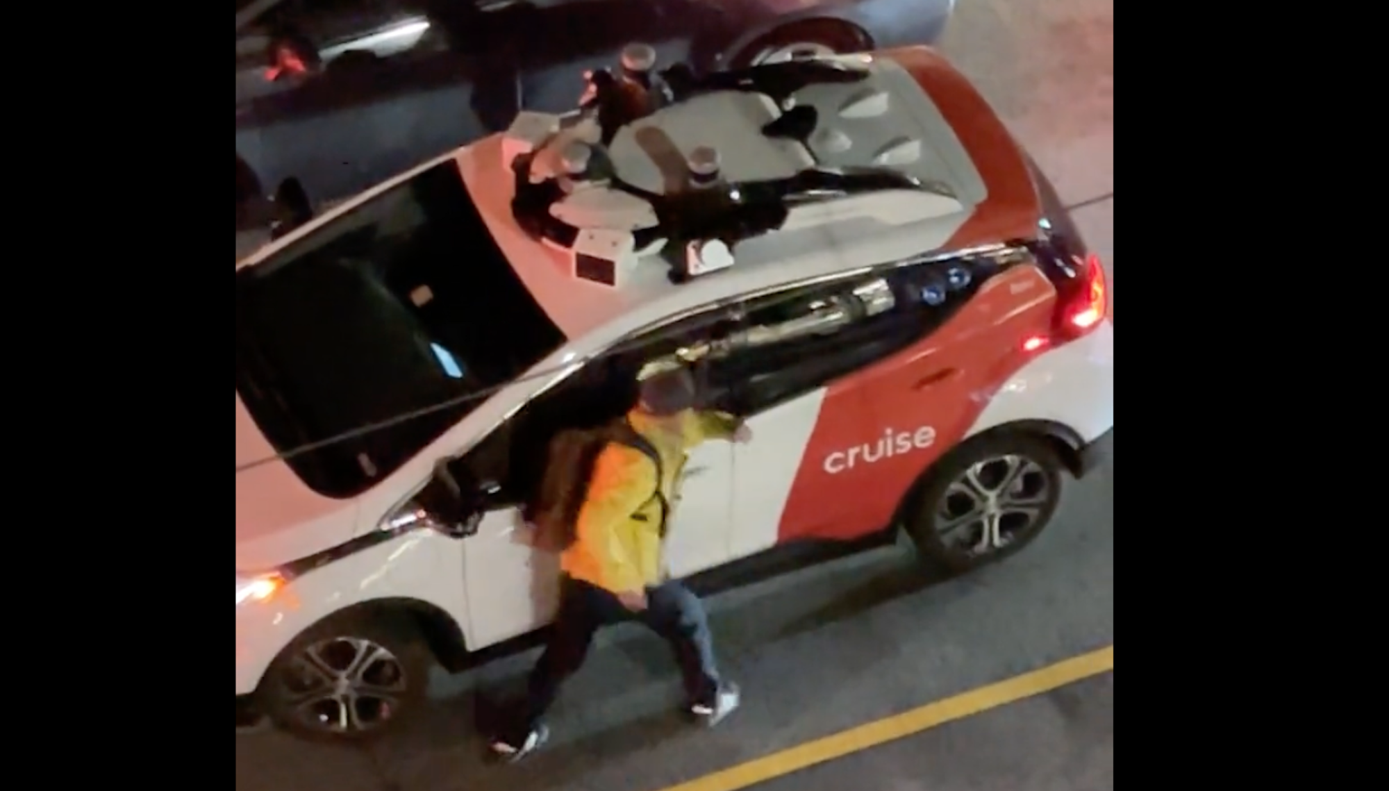 A few minutes earlier, some Cruise vehicles had apparently got stuck at this intersection. Whether and why the pedestrian was so upset is not known.