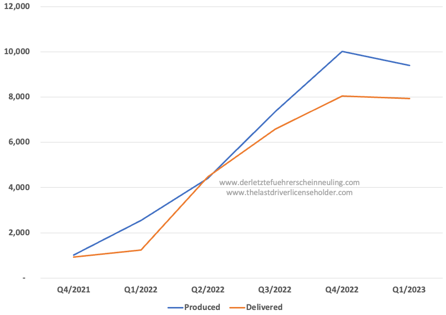 In its 6th quarter overall since starting production in 2021, California-based electric car maker Rivian has announced its Q1 2023 figures. It produced 9,395 vehicles and delivered 7,946. Compared to the same quarter in 2022, that’s a 268 percent increase in production and a 548 percent increase in deliveries. After producing 24,337 vehicles in the previous year – narrowly missing its own target of 25,000 vehicles – the company plans to produce 50,000 vehicles in the current year.