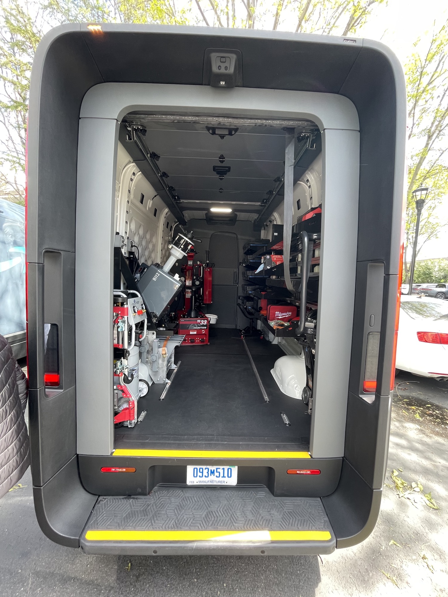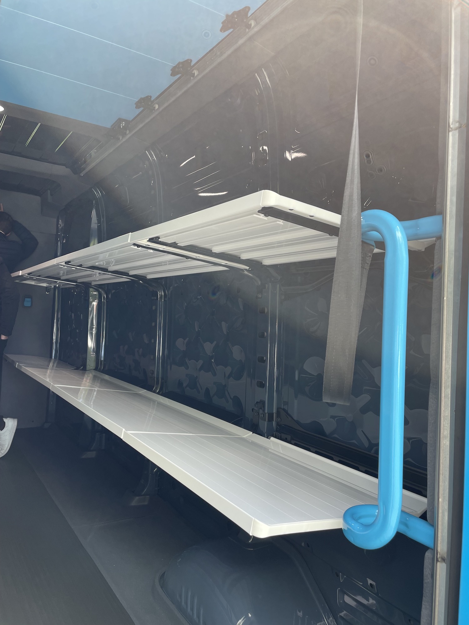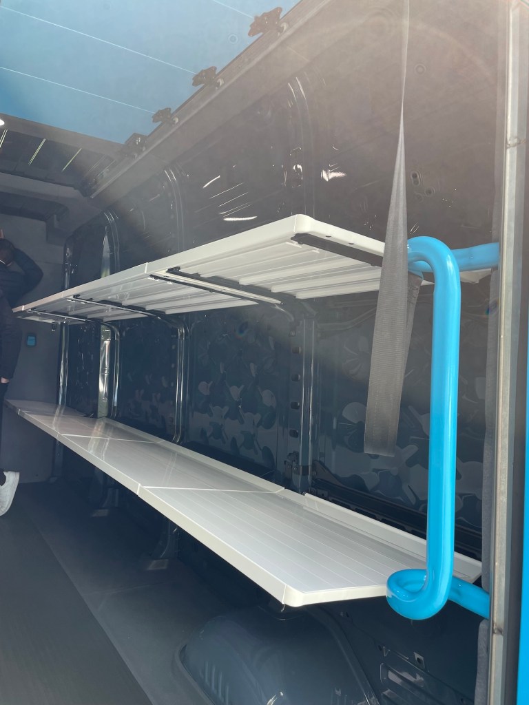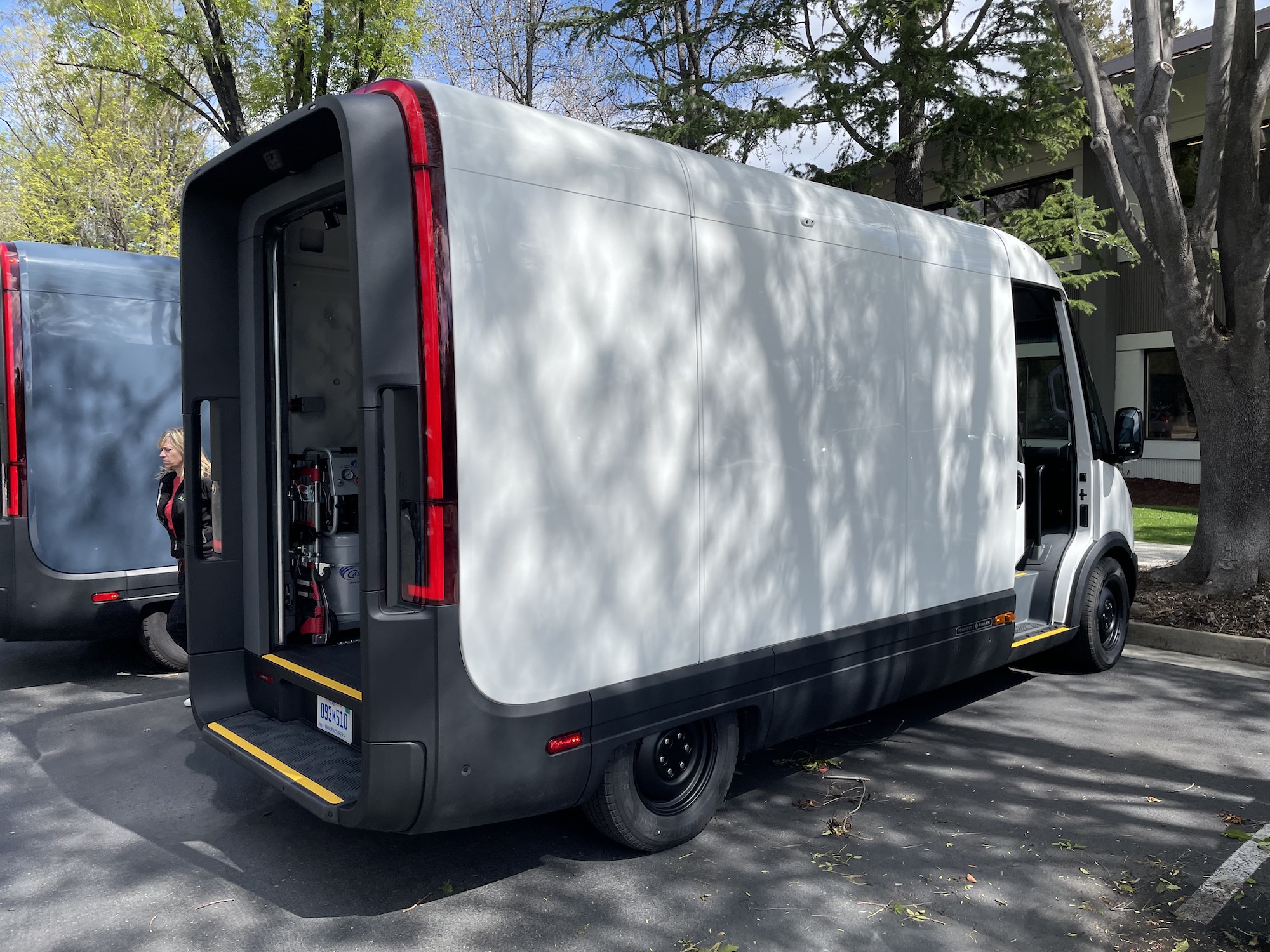 We had the opportunity to inspect two types of these all-electric delivery trucks. The blue one, in the colors of the most important customer and also shareholder in the company, Amazon, is the one used in the U.S. The retail giant has already received more than one thousand of the 100,000 ordered. Another 10,000 are scheduled to be delivered this year.