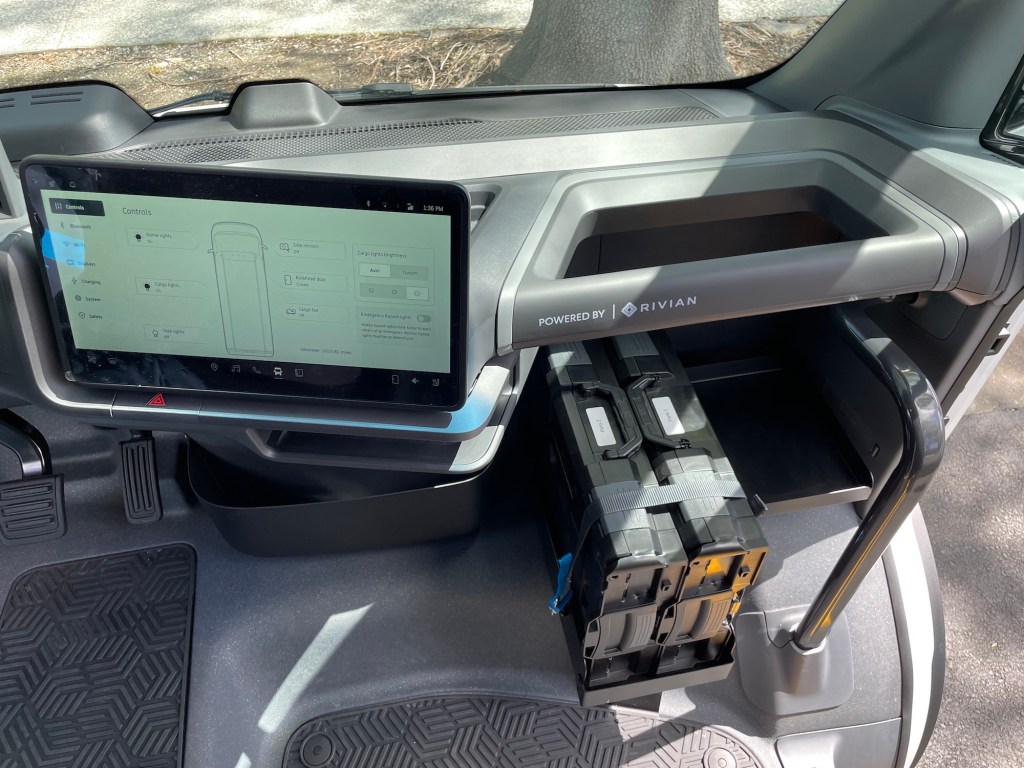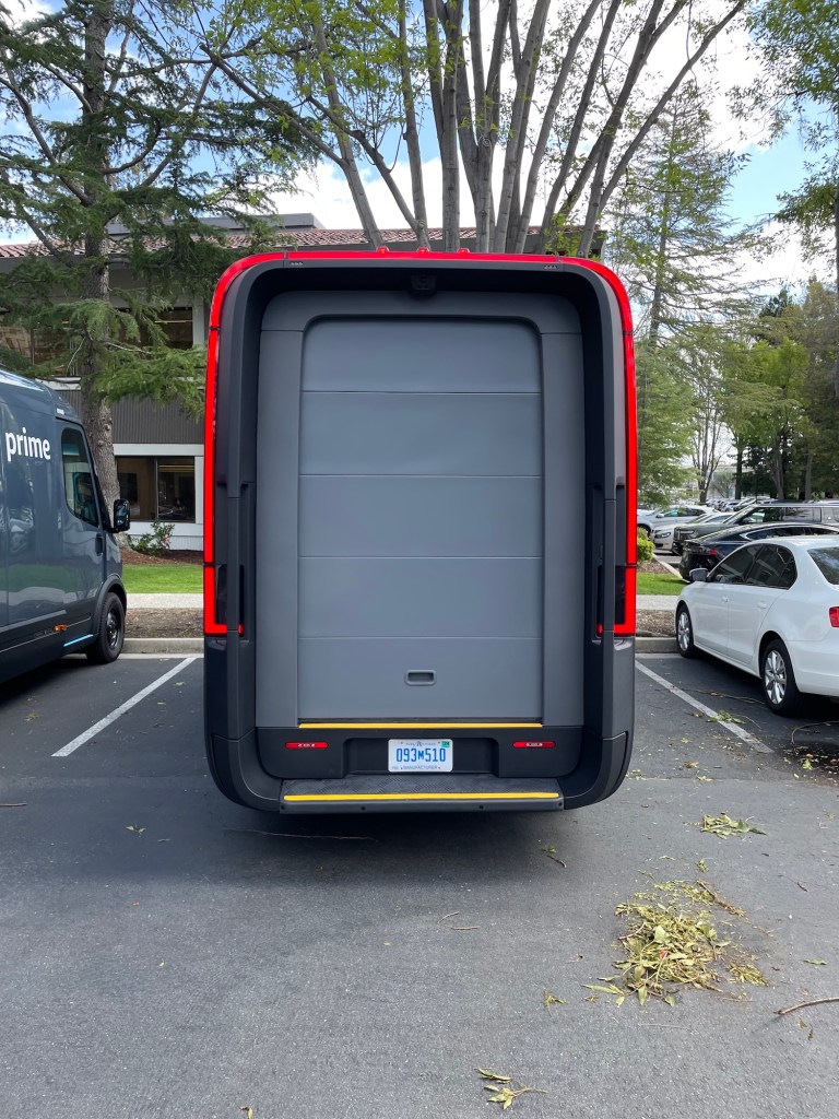 The smaller one, in white, shows the dimensions as it will be used in Europe. Slightly less wide, slightly less long, with both vehicles being based on a modular design. The length of both vehicles can be extended or shortened. This white delivery truck currently serves as Rivian’s service vehicle for the Amazon fleet.