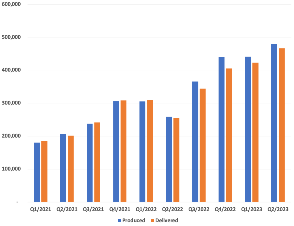 With 466,140 vehicles delivered and 479,700 produced, Tesla has once again presented a record quarter. 83 percent more vehicles delivered than the same quarter last year, and 10 percent more than the previous record quarter, the first quarter of 2023, with the Model 3 and Y taking the biggest chunk with 446,915 vehicles delivered and 460,211 produced.