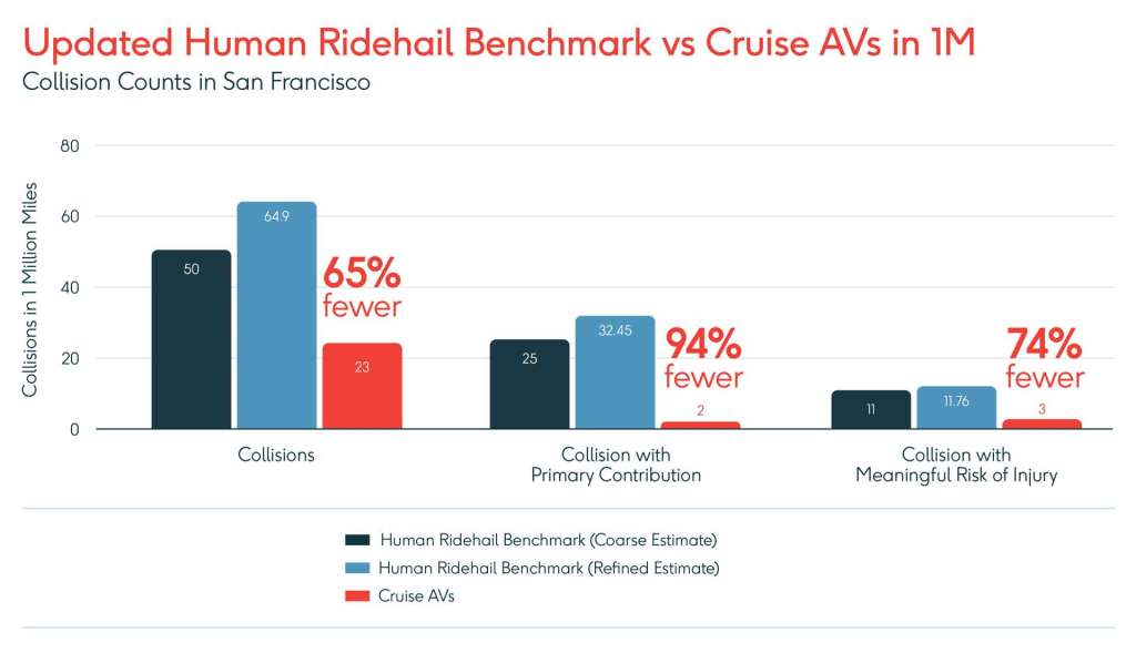 Compared to the first driverless million miles (1.6 million kilometers) of cruise robotaxis, they come in 65 percent fewer collisions than human drivers. In fact, they are 94 percent less at fault for collisions than human drivers. Injuries are also less frequent with robotaxis, at 74 percent.