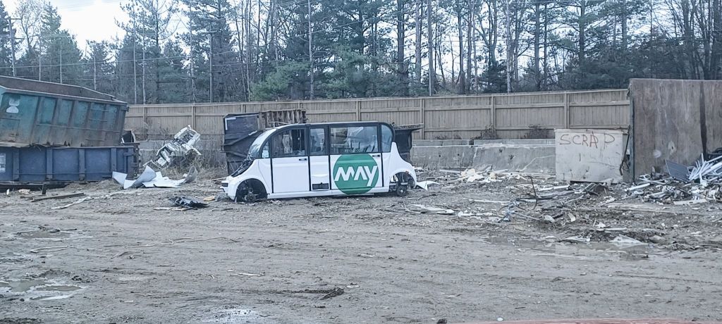 Are robot cabs going to heaven? I can’t say for sure for all of them, but one ended up in the junkyard. This Polaris GEM electric car, which looks more like an extended golf cart and was used by May Mobility and others as the first platform for developing self-driving technology, was spotted by systems analyst Eric Paul Dennis in an Ann Arbor junkyard. And completely unglamorous, without wheels and cannibalized, but a clearly visible May Mobility logo.