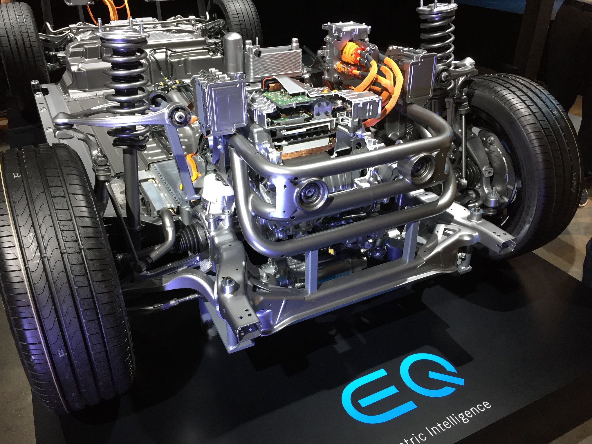 Beim EQC und dem EQS (aber auch bei allen anderen Elektrofahrzeugen) von Mercedes sieht man, wie es unter der Motorhaube aussieht. Und erkennt auch gleich, wie durch das Offenlassen des Antriebsstranges bei Elektroautos massive Rohrrahmen eingebaut werden müssen, um das Fahrzeug bei Unfällen sicher zu machen. So nebenbei packt Mercedes noch alles mögliche wie Kühlung oder Elektrik in diesen Bereich. Da bleibt nicht mehr viel übrig.