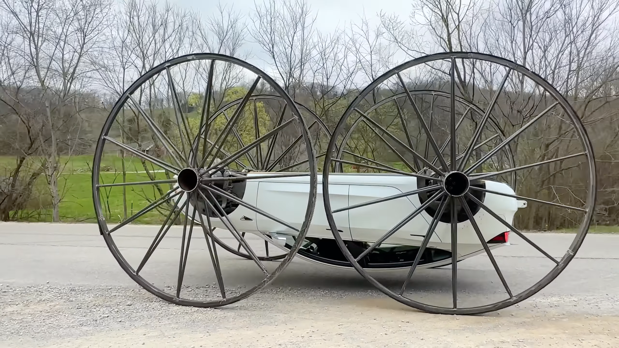 What does he show in the video? In addition to a few rough treatments, he mounts three-meter-high wheels that turn the Tesla into something like a carriage. Why does he do that? Not just because he can, but because he wants to drive the Tesla upside down.