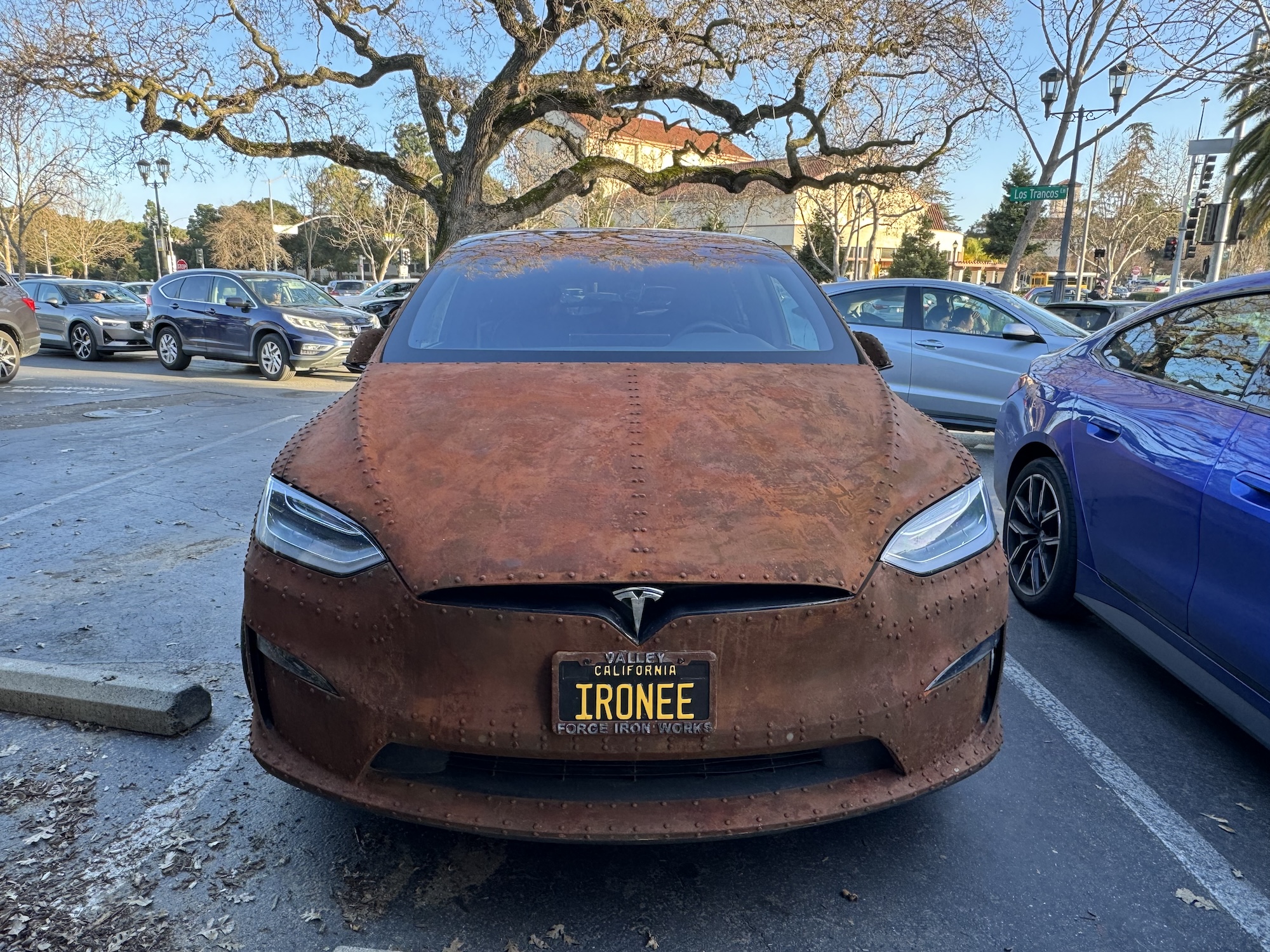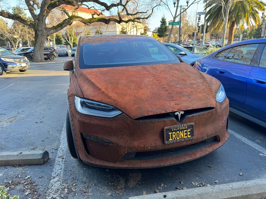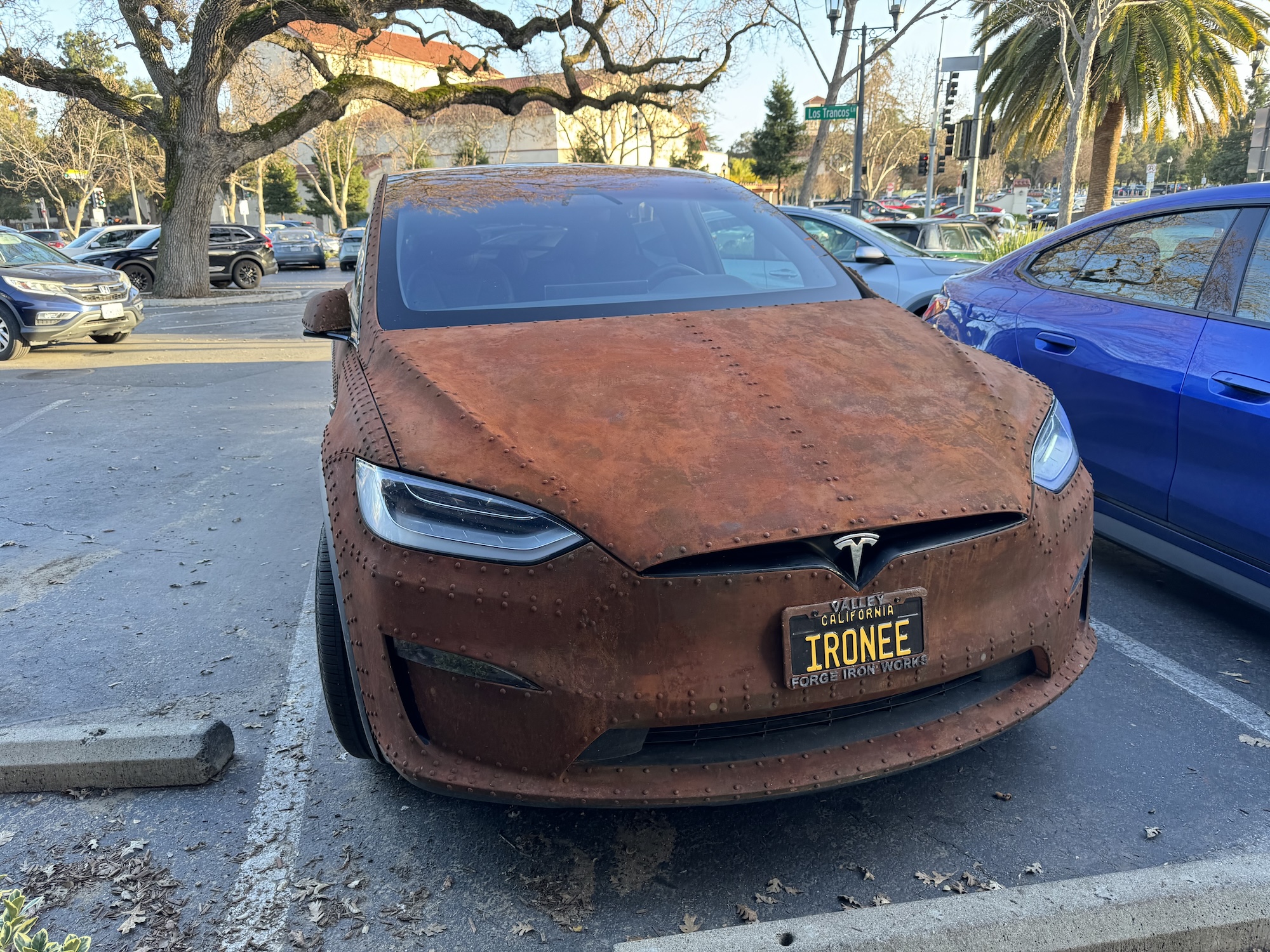 This rust iron clad Tesla Model X was spotted at the Town & Country Village in Palo alto on January 25th, 2024 at around 4:30pm PST. Here is a video: