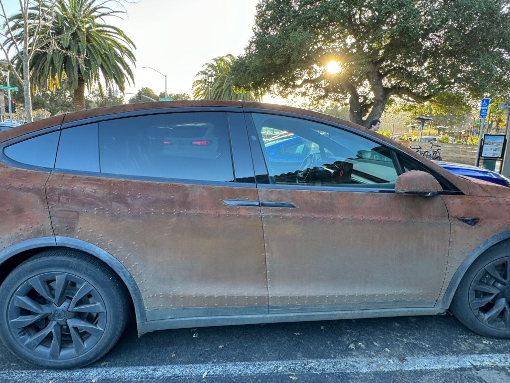Whether pink, silver or with a checkerboard pattern. We have already seen many Teslas in different colors. But this Model X took the cake. A Tesla covered in rusty iron and lots of rivets was parked in the parking lot of a local shopping and restaurant mall in Palo Alto. And yes, I touched the vehicle and can confirm that it was iron.