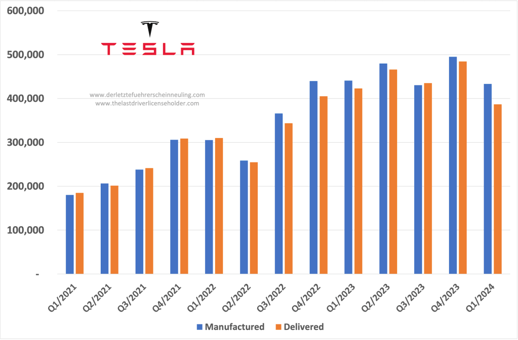 Tesla is dominating the headlines again this week, at least in the automotive world bubble. First, the delivery figures in the first quarter of 2024 were disappointing, with 386,810 units delivered, down 9 percent on the same quarter last year, and production, at 433,371, down 2 percent on the same quarter last year.