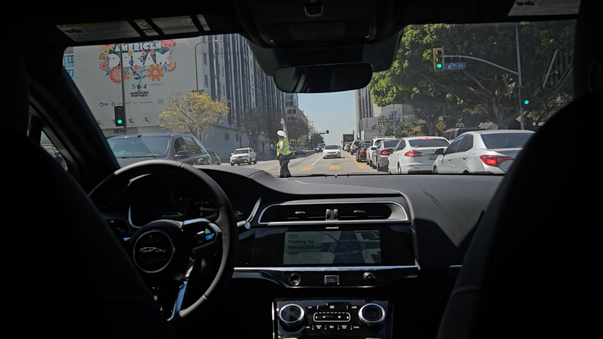 A very interesting example of how a Waymo Robotaxi reacts to the hand signals of a traffic police officer was recorded by YouTube user Ollie in Los Angeles. You can see the Waymo trying to turn left at a junction controlled by a traffic policeman. The traffic policeman indicates to the vehicle to come closer, then stops the oncoming traffic and instructs the Waymo to drive. It reacts immediately and turns left.