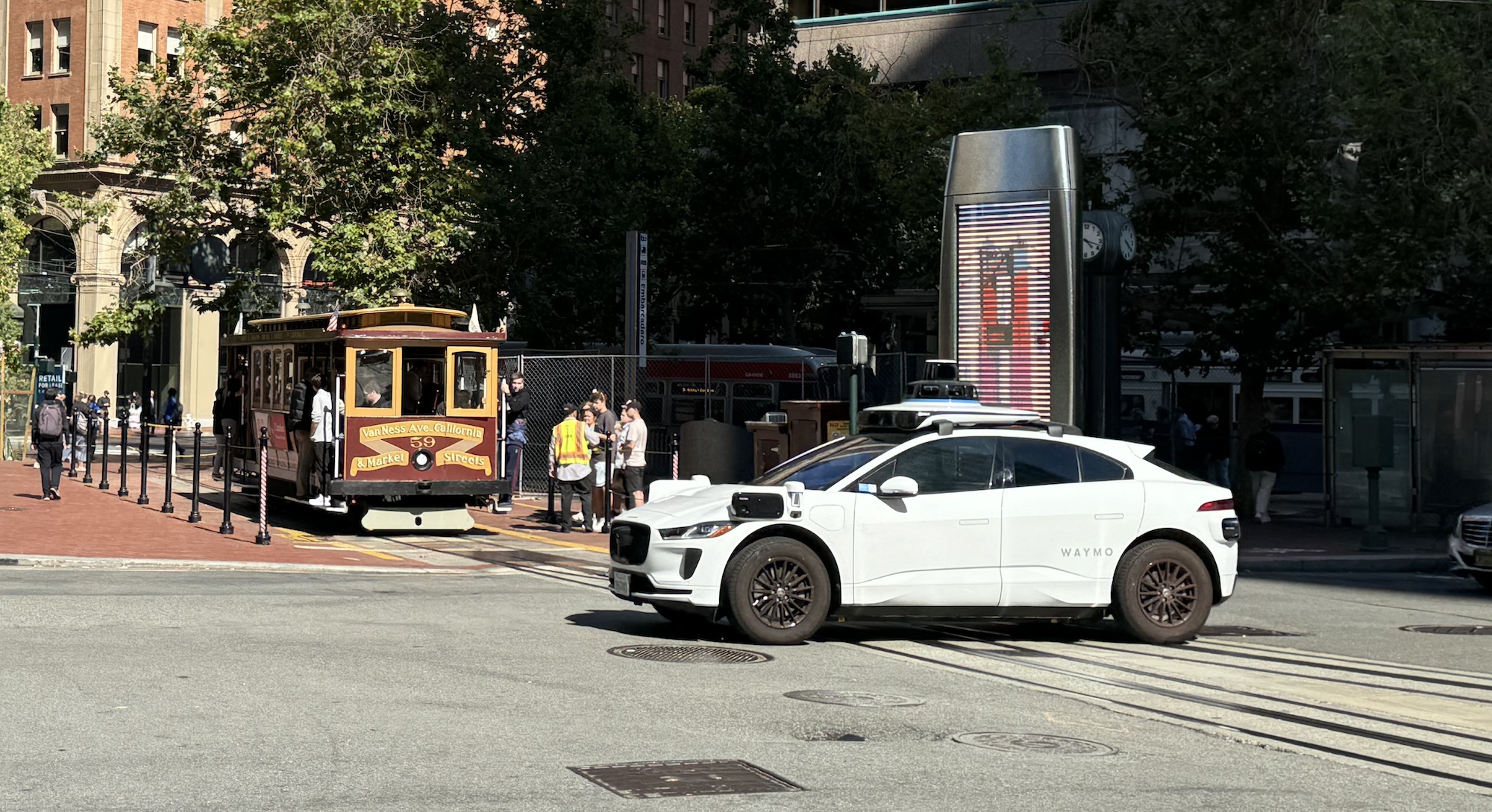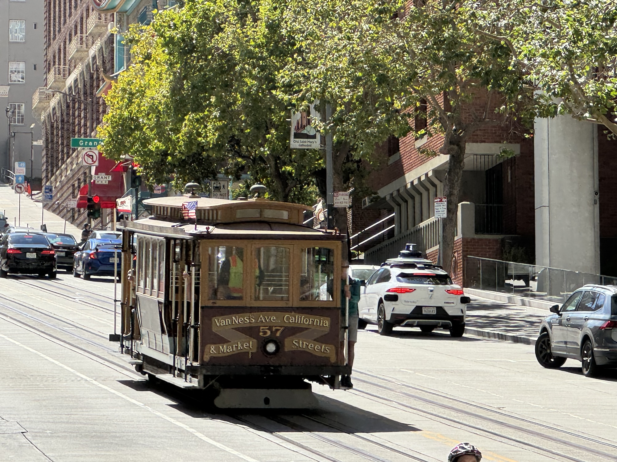I had long wanted to take a photo of this contrasting pair by photographing Waymo next to cable cars, and yesterday I took a little time and went in search of one. I managed to get a few photos, not the best, but still. And I’m sure that other people have taken much nicer photos, but these are mine:
